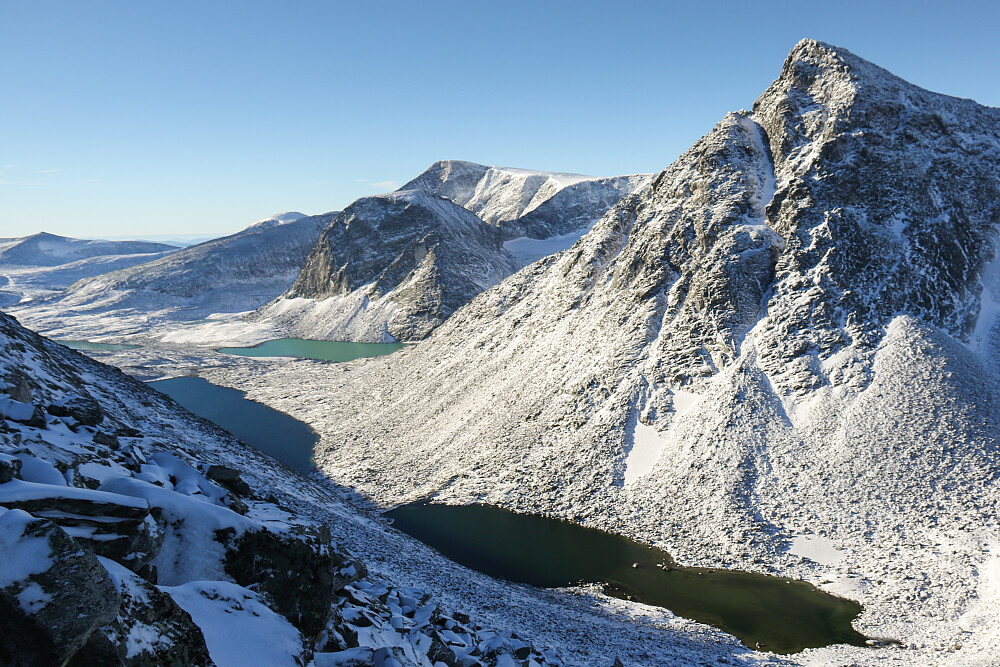 Nysnøen lå fra 1400-1500 moh og opp, men det var ikke særlig til frost i bakken, så de fryktede "is-under-snø-i-ura"- forholdene uteble. Det var likevel enklest hvis man greide å tråkke på de steinene som lå over snøen, så da gjorde vi stort sett det. Turen opp (og ned) østryggen blir morsomst hvis man går kant i kant med stupene på nordsiden - det syntes i allefall vi. Mange fine utkikkspunkter langsmed der.