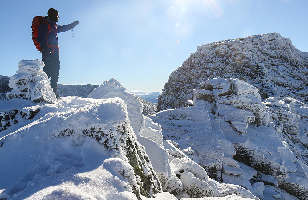 Først fulgte vi egga rimelig greit bort til den første varden, som ligger på et lite toppunkt nord for Nørdre. Det var snø og rim og is i omløp. Fra varden og bort til Nørdre Larstinden ble vi nødt til å slippe oss ned i vestsiden av egga, og vi kom til et punkt jeg ikke likte fordi jeg måtte legge an leggen på en stein i hoftehøyde og dra meg opp etter armene sånn at jeg fikk foten opp der leggen var, og da foten skulle få vekt på seg var det glatt. Dessuten var vindvottene mine helt stive av gårsdagens fukt kombinert med dagens minusgrader, så det nyttet ikke å ha de på. Tjukke ullvotter på nysnøstein gir ikke akkurat verdens beste håndgrep og det var flere steder det var litt ekkelt og uforutsigbart underlag. Vi kom oss opp til Nørdre Larstinden og var så nær så nær selveste hoved-Lars. Vi greide imidlertid ikke å komme oss bort til der hvor rappellen begynte. Ikke skjønte vi hvor vi skulle gå, og selv om det helt sikkert er åpenbart når alle lister og sprekker i steinen ligger framme i glaninga virket det rimelig håpløst og ikke minst utsatt nå som fjellet var bedekt av snø og mesteparten av fot- og håndtak var godt gjemt.