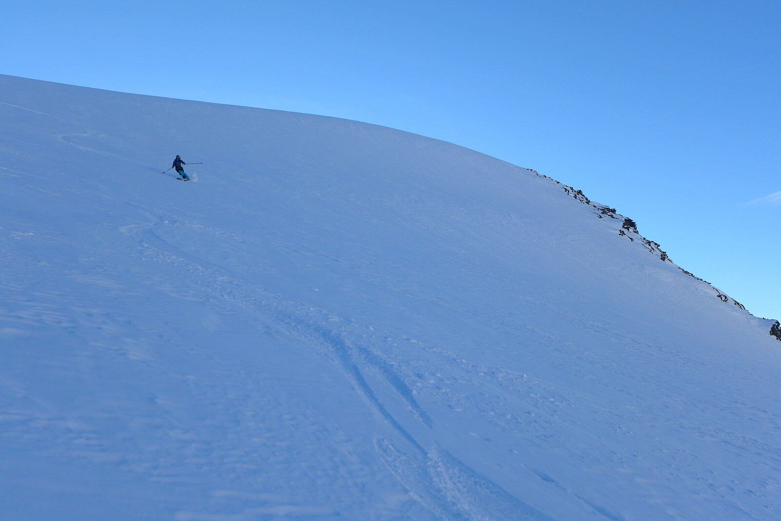 Etter traversen var unnagjort ble det en god stund i skygge igjen, faktisk helt til vi kom oss opp til toppen. Store kontraster med det varme shortsvær vi hadde på traversen (ingen av oss gikk i shorts, men jeg mente at det varmt nok for å kunne gå i shorts akkurat der...). Det var litt artig å se tilbake på Maritindane fra denne vinkelen også. Det så ut som om noen hadde kost seg godt i den østvendte flanken ned fra den 1045-toppen. Pene puddersvinger!