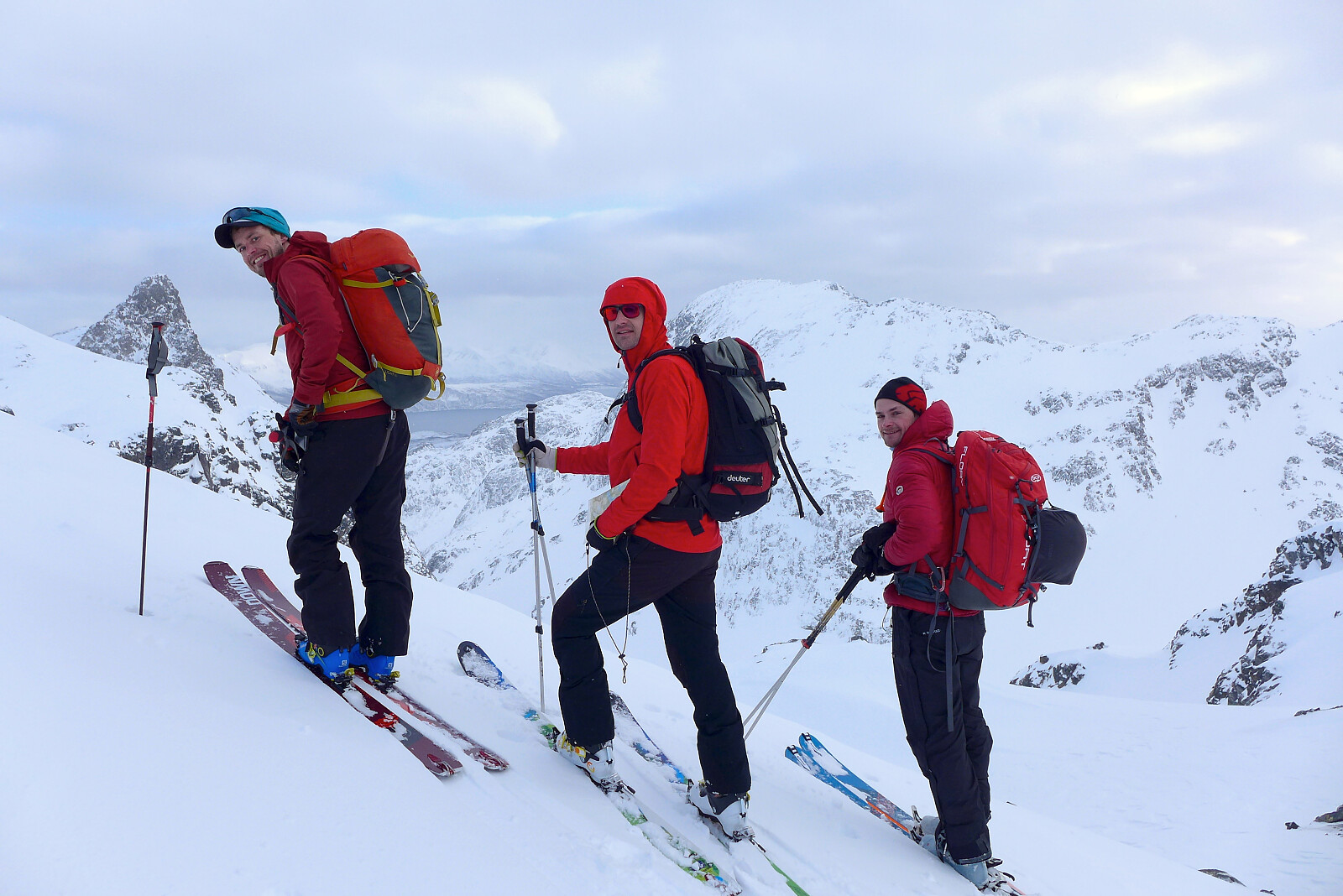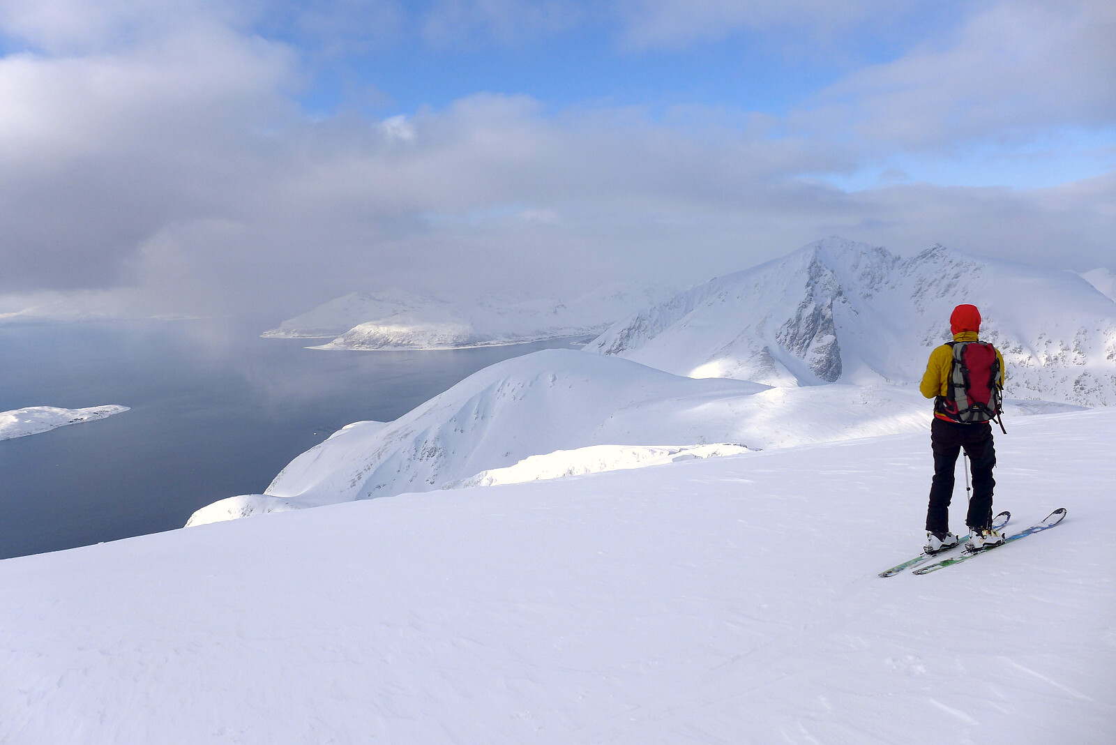 Den opprinnelige planen var å fortsette opp mot breen på nordsiden av Storsandnestinden for å finne god snø og artig skikjøring, men fra vannet så det ikke ut til å være verdens beste skiføre der, så vi droppet denne etappen og tok en matpause før vi skulle ta fatt på den neste bratte bakken på sørsiden av vannet. Vi hadde tenkt oss en rute opp midten av et søkk og ifølge NGIs bratthetskart var det ca. 50hm med 30-35 grader her, så vi tok en ny vurdering fra et trygt sted på en liten vindutsatt rygg på østsiden av den. Utfra våre observasjoner av snøen som lå nederst i søkket var det et lag med lett bundet snø og stedvis litt vindskare, som kunne gi oss et inntrykk av det som skulle forventes i det brattere partiet. Til slutt ble det bestemt at en av oss ville gå først for å teste forholdene og derfor ikke utsette mer enn en persom om gangen. Jørn var ivrig og meldte seg frivillig til oppgaven mens resten av oss observerte fra siden av søkket. Det viste seg at forholdene var bra nok til å fortsette, så resten av oss fulgte på med litt avstand. Etter denne bakken ble det en god del flatere og vi gikk innover dalen for å nå breen på sørøstsiden av Storsandnestinden. Herfra ble utsikten bare bedre og bedre med både hav og snøkledde fjell rundt oss.