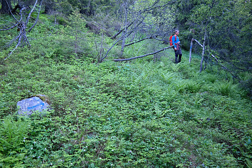 Etter hvert forlot vi grusveien og svingte til venstre for å følge traktorspor et stykke. Vi nådde nå dagens tyngste motbakke - den bratte østsiden på Velebufjellet. Her hadde jeg forventet at vi måtte kave oss oppover i tett skog, men jammen dukket det ikke opp litt slitt blåmerking her. Så beleilig da! Stien der blåmerkingen var, er ikke veldig mye brukt. Den var så vidt synlig enkelte steder, men allikevel til god hjelp. Her var det fullstendig vindstille, og hva er det da mye av i frodig fjellskog sånn langt ut i juni...? Jo mygg! Vi kunne ikke stå lenge stille her før det surret godt med disse blodtørstige, små skapningene.