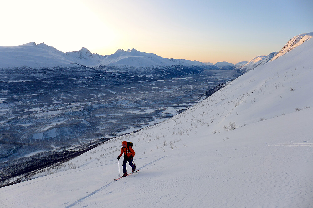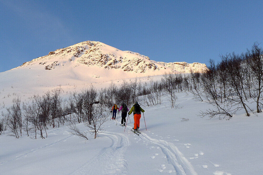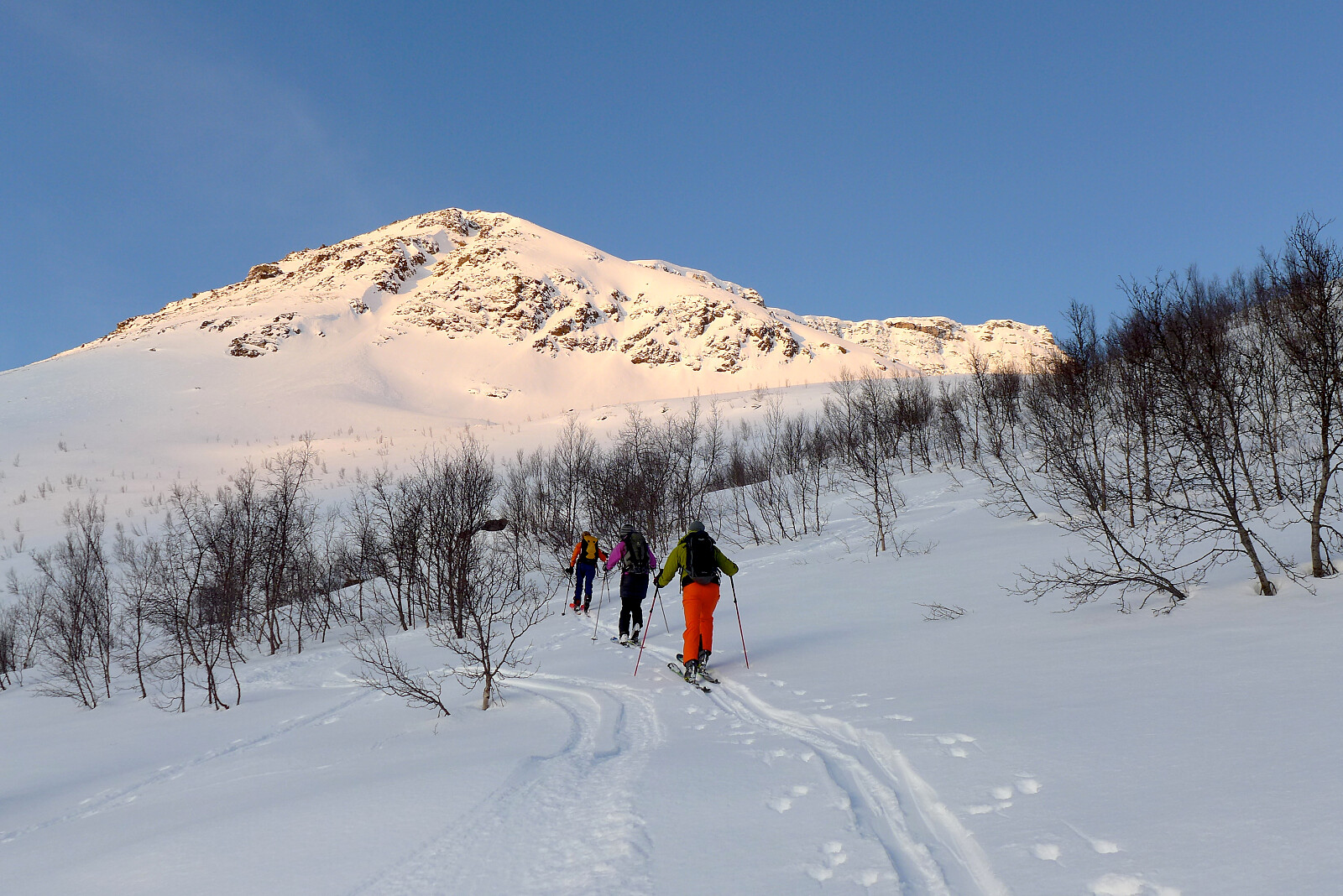 For oss andre gjaldt det å bevege oss så snart som mulig for å komme oss høyere opp på fjellet. Dalen er kjent for å være vanvittig kald ift kystklimaet i Tromsø og vi visste at det ville bli en god del varmere i høyden. Vi benyttet noen spor i skogen som ikke gikk gjennom det mest åpne området så det tok ganske lang tid før vi hadde kommet over tregrensen. Her var det omtrent samme snøforhold som på gårsdagens tur til Tromsdalstinden, dvs. ca. 5-10cm lett puddersnø på en ellers veldig hard og glatt skare. Det gjorde det til tider ganske utfordrende å vende seg der det var litt brattere og jeg fikk låne skarejern fra Jana siden jeg synes det var ganske ekkelt å risikere utglidning. Etter å ha kommet opp til den brede dalen over tregrensen tok vi sikte på den slakeste ruten opp mot sørryggen på Langdalstinden. Her var underlaget betraktelig mykere enn lenger ned, så nysnøen festet seg bedre og det gikk ganske greit å gå uten skarejern. Oppe på ryggen tok vi en liten pause i sola før vi fortsatte opp til toppen.