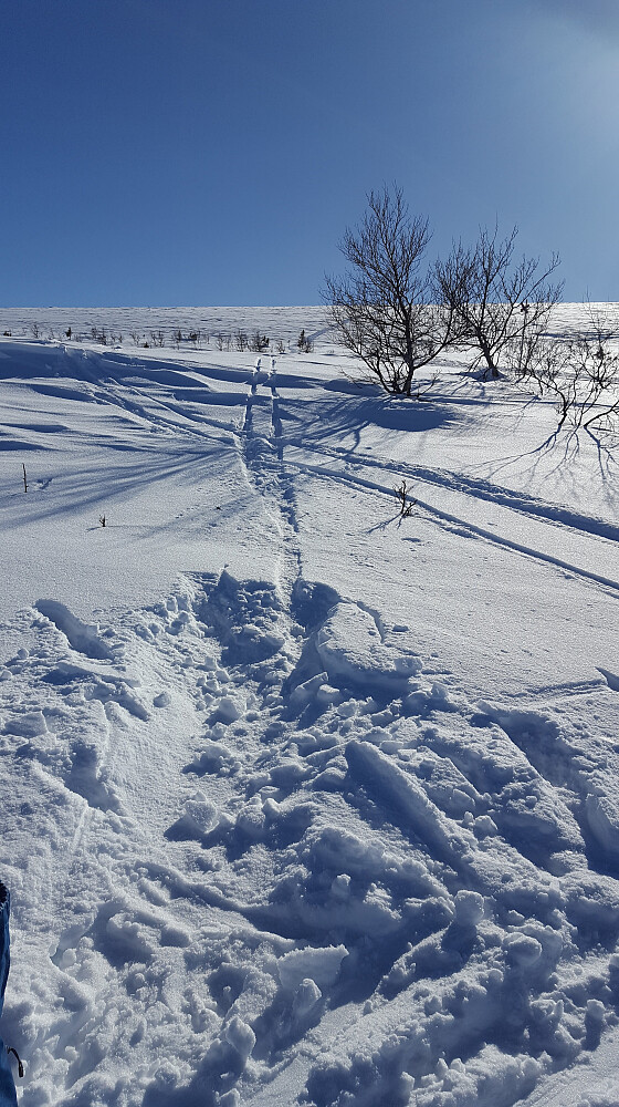 Ooog på bildet under gikk det galt.. Etter sikksakk kjøring der det var som brattest og hard skare, slapp man opp litt når det ble mere snø. Så derfor ble det stor fart og sååå lugget det i en hardpakket lav snøfonn. Stillingen gikk fra lettere bakoverhockey og full kontroll, til en veeldig fremoverlent Bokløvaktig flaksende måke som tryna som en meteor fra oven. Brystet landa først, beina (og skia) fulgte etter og over ryggsekken som en stor U. Fikk en kakk i huet, først av isen/fjellet så av skia. Med kun et tynt snølag over isen, var det ikke noe som fjæret. Her var det en kontant landing som Solan Gundersen sa...