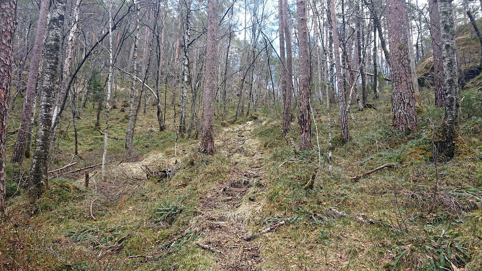 My next goal was Reppåsen and I had noticed a trail to the southeast of Skantane coming up from Bødalen, and therefore headed in this direction. At first across open terrain, but soon a minor bush war had to be fought before reaching what turned out to be an old tractor road. And while it was clear that the tractor road had not been used for many years, it still made it easier to progress east towards the indicated north-south trail.