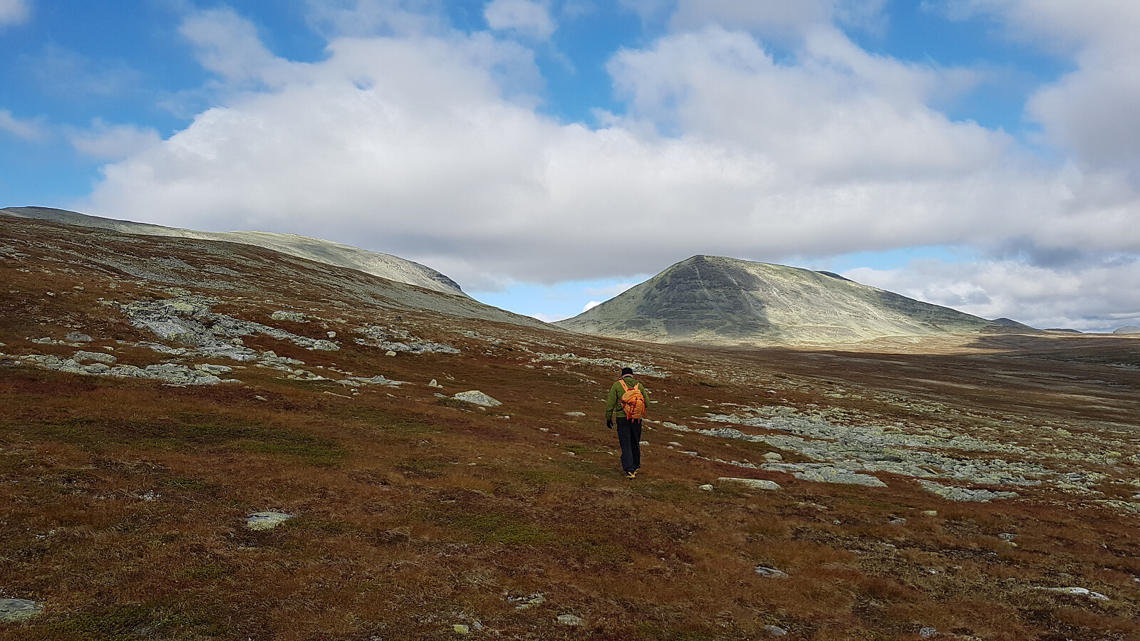 Vi satte syklene litt øst for høyeste punkt og startet og gå i stiløst men stort sett lettgått (særlig når vi unngikk områdene med reinlav..) terreng i retning Gravskardet. Så et par reinsdyr, og nærmere Gravskardet traff vi en enslig turgåer i friskt driv fra Breisjøseter over Gravskardet til Straumbu.