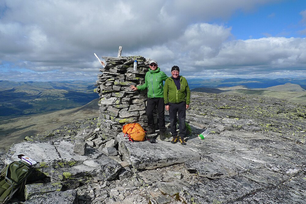 Noen hundre meter nord for toppen flatet det plustelig ut, og på de for området karakteristiske flate steinene kunne vi spasere bort til den flotte toppvarden. Vinden, som hadde vært påtagelig på vei opp mot Gravskardet, hadde etterhvert spaknet, og også en meget tålelig temperatur innbød til et lengre opphold på denne flotte toppen.