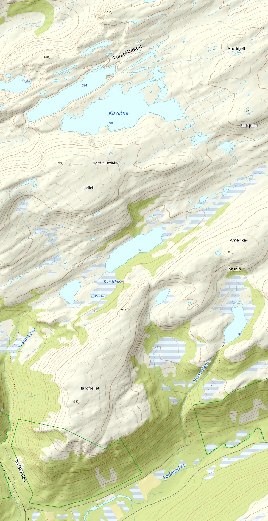 Årets siste langtur. Opp etter skogsvei /sti før jeg tok bratt opp på Hardfjellet. Brukte lang tid hit da jeg får problemer med pusten når det er bratt. Videre lettgått og fint til Amerikabrunin. Her ble det matpause. Så over dalen og opp på Storlifjell. I dalen var det forholdsvis mye snø av ymse kvalitet. Lettgått videre til Torsetkjølen. Greit ned til Kuvatna. Så litt småskummelt ut med mye våta sva opp til Nørdkvistdalsfjellet. Svaene var imidlertid noe ruglete så det gikk fint. På toppen her passerte en rypejeger, uten å være pratesjuk! Greit for meg for, jeg kjørte på alt jeg orket for å slippe å vente lenge på ferja.
