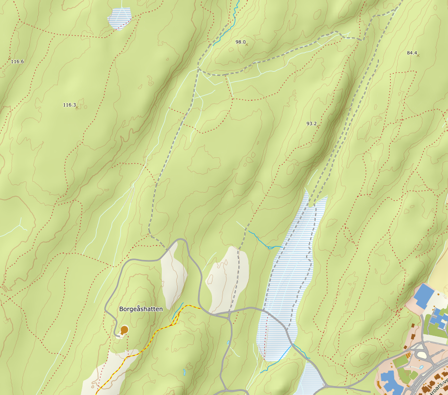 Kjørte fra vakre Løvøya ved Horten til Tok av E6 og fulgte vei 112 i retning Greåker og senere vei 109 retning Fredrikstad. Tok så Hatteveien til Rekustad skoles p-plass. Parkerte her, god plass i dag da det er ferie på skolen. Her startet vi på en grusvei og fulgte den oppover. Lurte på å sveive oppom Borgeåshatten, men Kristen mente vi skulle spare energi, så vi ombestemte oss under veis. En varde på høyeste punkt midt i stien, men vi var oppom flere steder for sikker hets skyld. Et myss av stier og veier her og merket med steder jeg ikke fant på kartet. På vei ned tok vi en annen sti. Videre til neste topp.