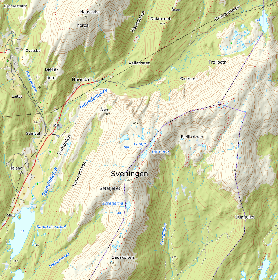 Fire herrer og tre bikkjer la ut på tur. Vi satte fra oss én bil ved tele-masta ved Samdalsvatnet (der vi planla å komme i mål) og kjørte videre til P-plassen ved bussnuplassen i Hausdalen. Derfra bar det til fots innover militærveien nesten 3 km før vi begynte oppstigninga mot Sveningen, Etter hvert som vi kom høyere i terrenget ble utsikten mer og mer spektakulær. Dette er nok ett av de fineste utsiktsfjellene i kommunen!