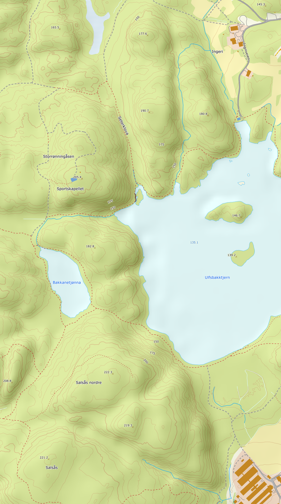 Jeg kjørte mot Sky skole og deretter inn mot Ingrigårdene. Stor parkeringsplass rett før den øvre gården. Her fulgte jeg grusvein ned mot Ulfsbakktjern og videre på god sti til Storønningen sportskapell. Fin utsikt her. Deretter videre til toppen av Salsås. Flott bøkeskog på toppen her.