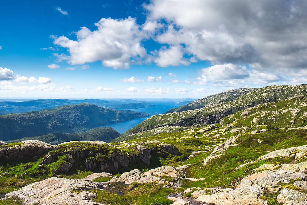 Oppe i høyden var jeg først innom varden på kanten mot Austfjorden. Spektakulær utsikt her oppe ned mot stistart ved E39 og utover. Fortsatte videre mot stålmasten og varden som nok er turmålet for de fleste som går opp her. Derifra og videre til toppen var det greit å følge små varder stort sett hele veien. Jeg mistet varderekken ved et par tilfeller, men toppen er grei å se så man kan nesten ikke gå feil.