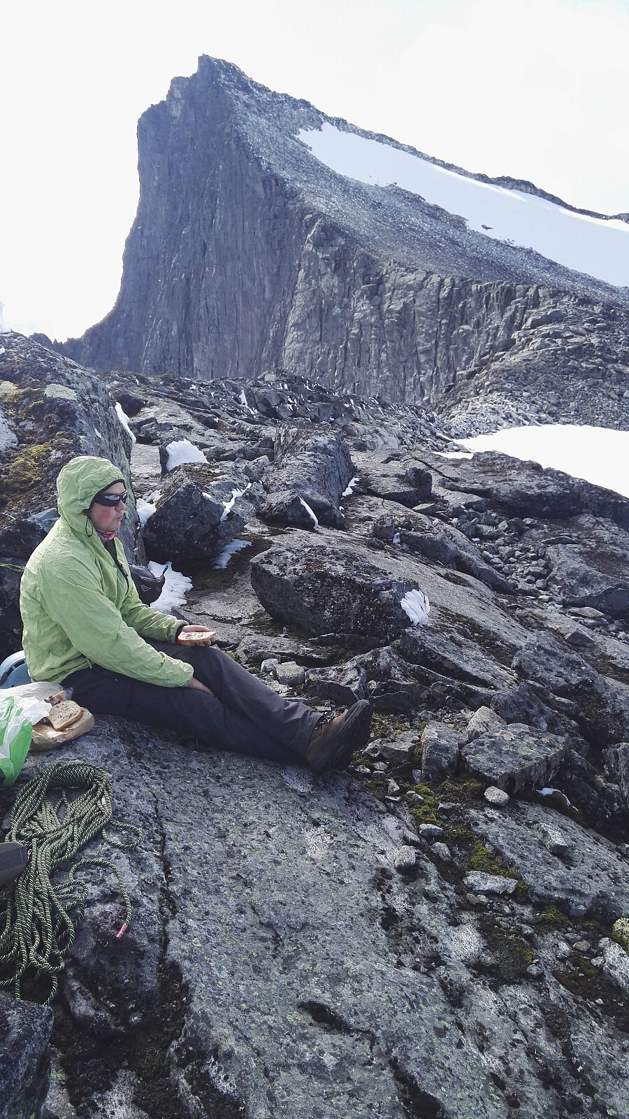 Oppe på ryggen tok vi en matbit. 2t 20 min hadde vi brukt, og skjønte dermed at det kom til å bli tid for Stølsnostinden også i dag. Vi satte igjen sekkene, og gikk så etter lunsjen mot Falketind.
