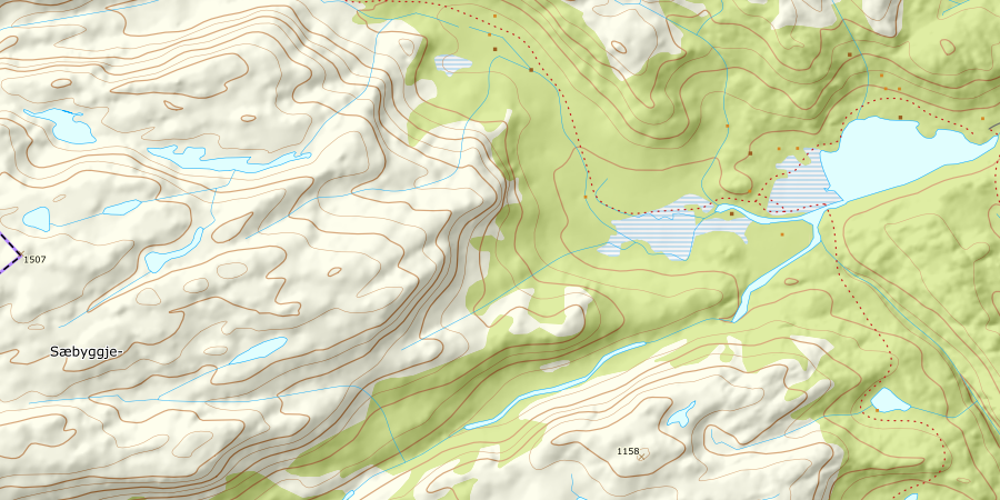 Mistet stien et par ganger. Kryssing av 2 elver ved større myrområde lenger vest, såpass stor vannføring at jeg ble våt i skoene. Egentlig ganske lettgått på denne myren, som var fast og fin og egentlig lite våt; det var vel heller mer en flat morene/grusslette enn klassisk myr. Mistet sti på nytt etter elvekryssingen, og litt bushing før jeg fant den igjen før stigningen opp Sæbyggjebrokka startet for alvor.