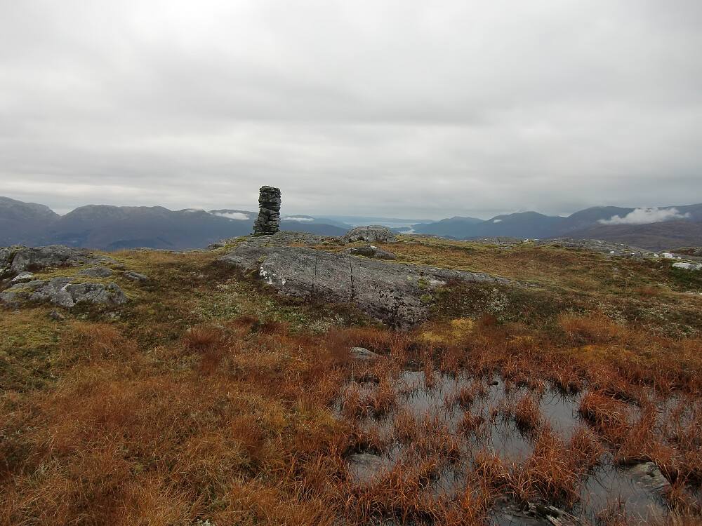 Fra demningen fulgte jeg tråkk bratt opp ved mindre bekk og kom opp ved lite vann øst for Storenuten. Stor varde på toppen. Mindre utsikt en jeg hadde regnet med da toppen ligger inne på en større platå. I tillegg begynte det å gråne til i vest med lavt skydekke.
