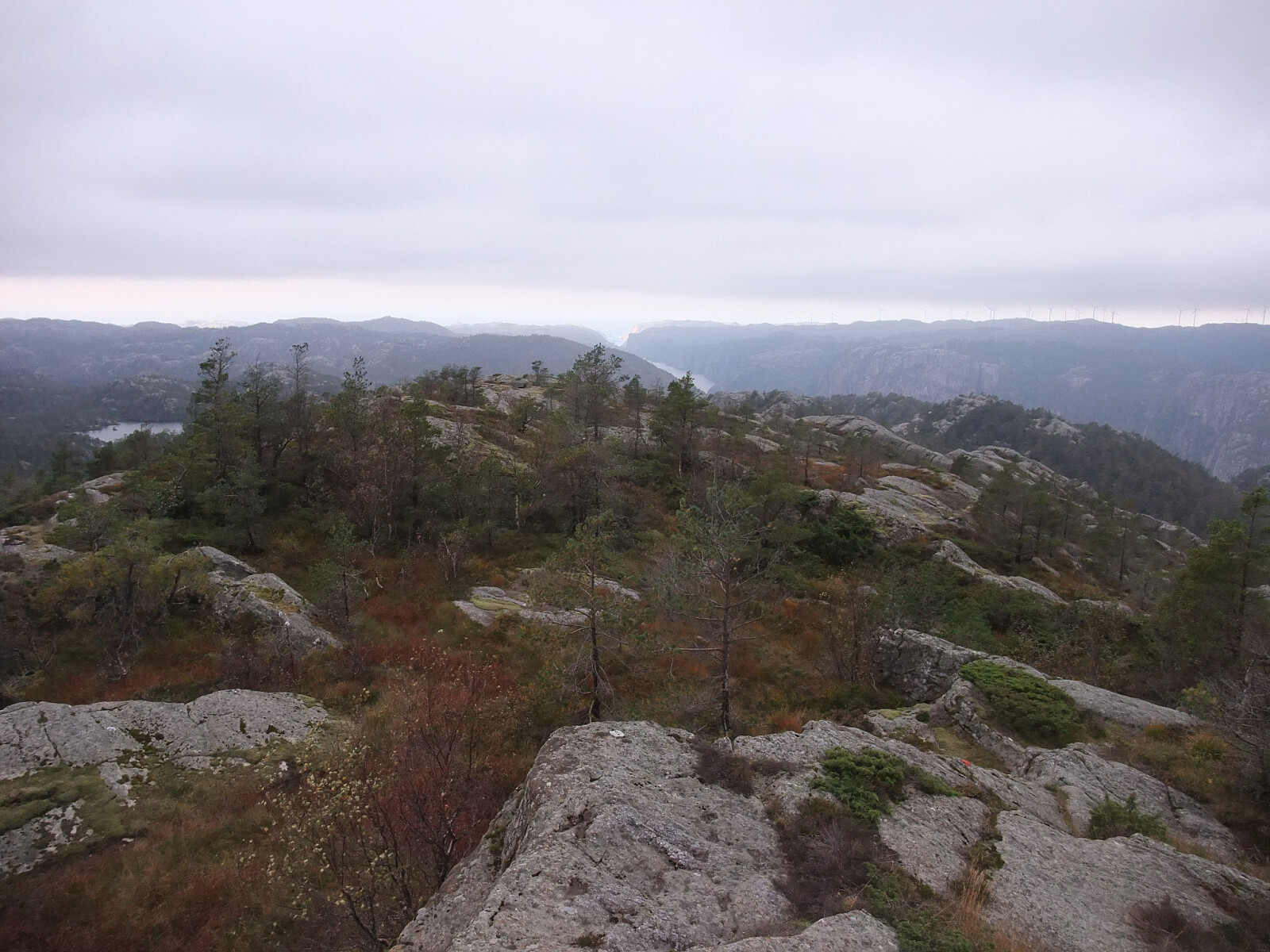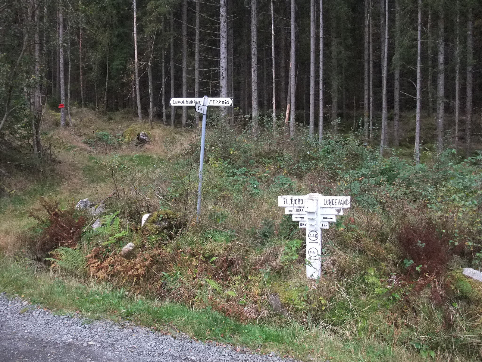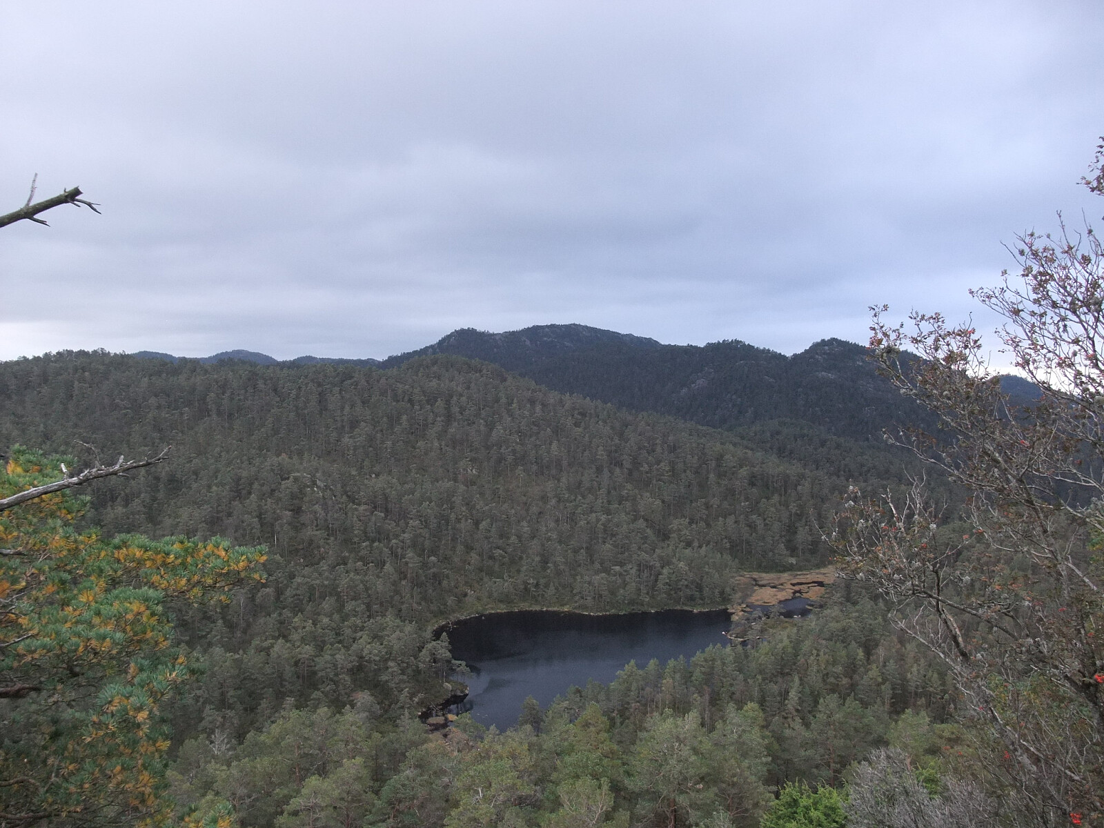 Fulgte så sti ned langs nordsida av Krokevatnet skilta mot Helle. Frå austenden av vatnet ein tur oppom 387-toppen på sørsida av vatnet. Så nordover i terrenget via vestsida av Fiskelaus til eg kom inn på sti og skogsveg til Soland. Der er det også merka sti til Solandsvarden, mens eg fulgte ein annan merka sti opp sørsida til Lafjell. Vardebok på utsiktspunkt på søraustkanten. Mobilmast på toppen. Sti ned nordsida til utgangspunktet.