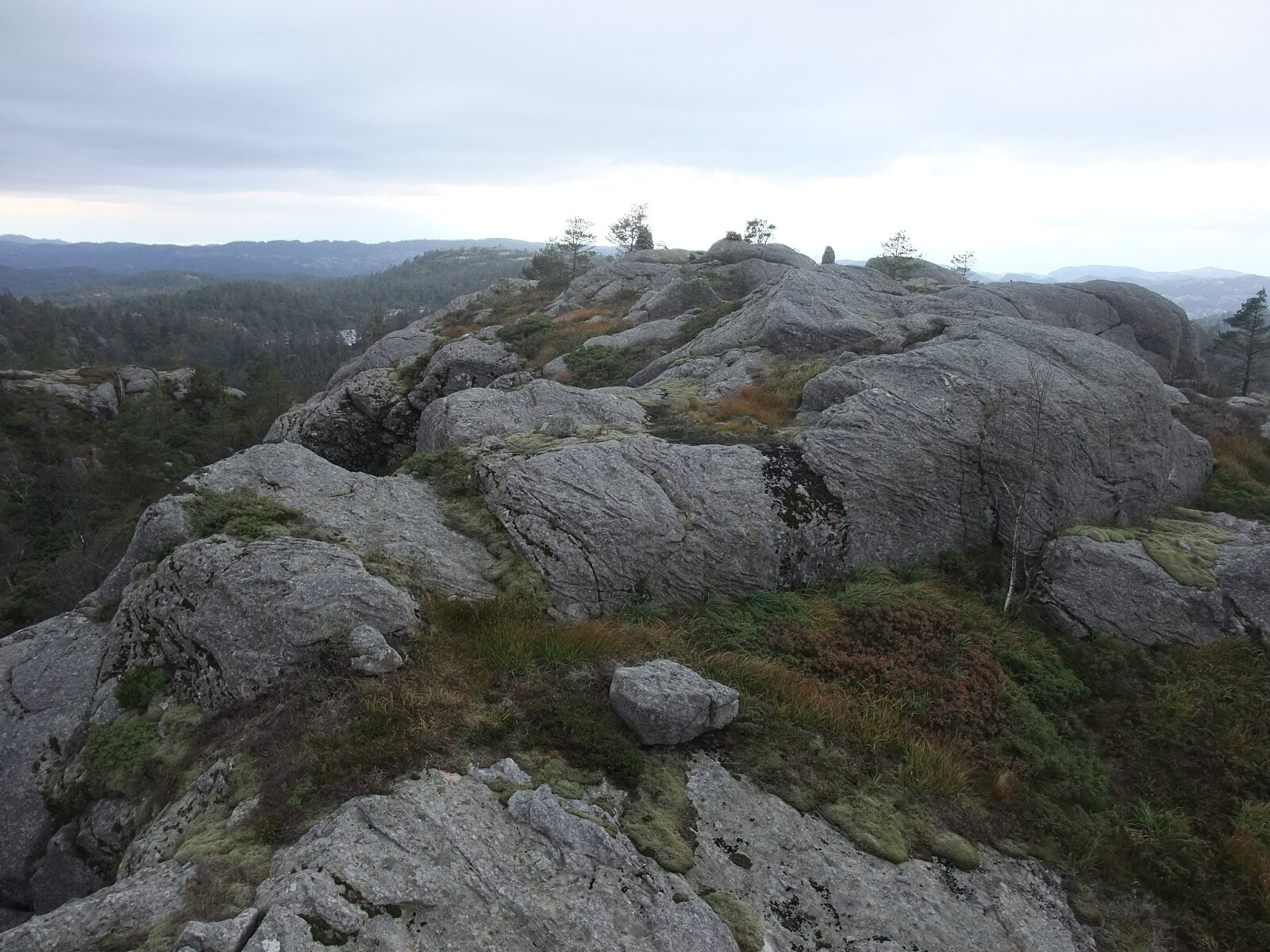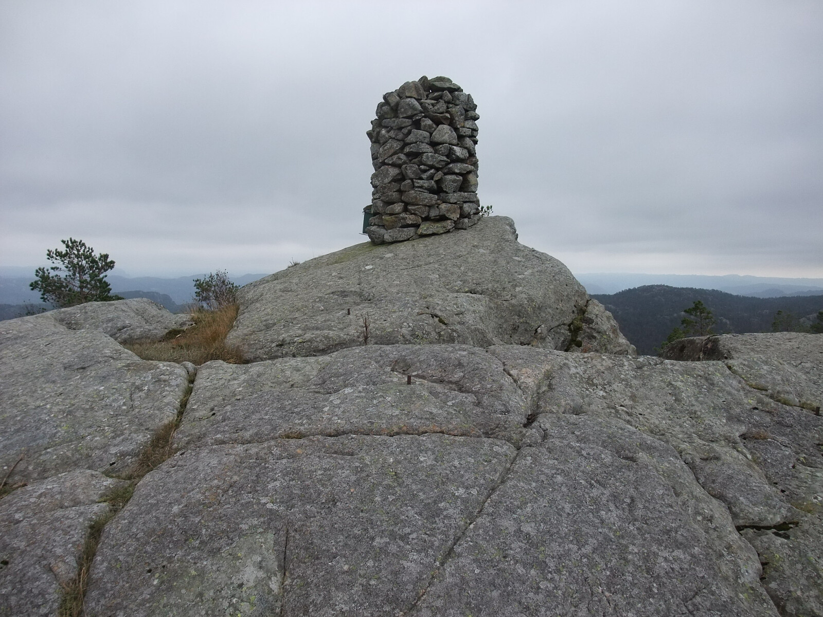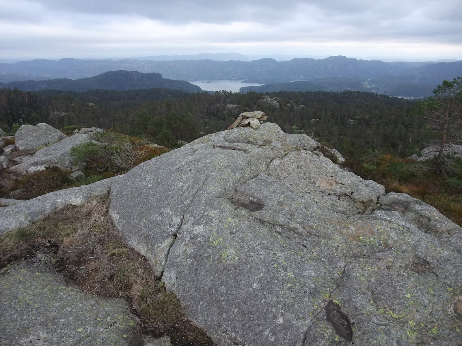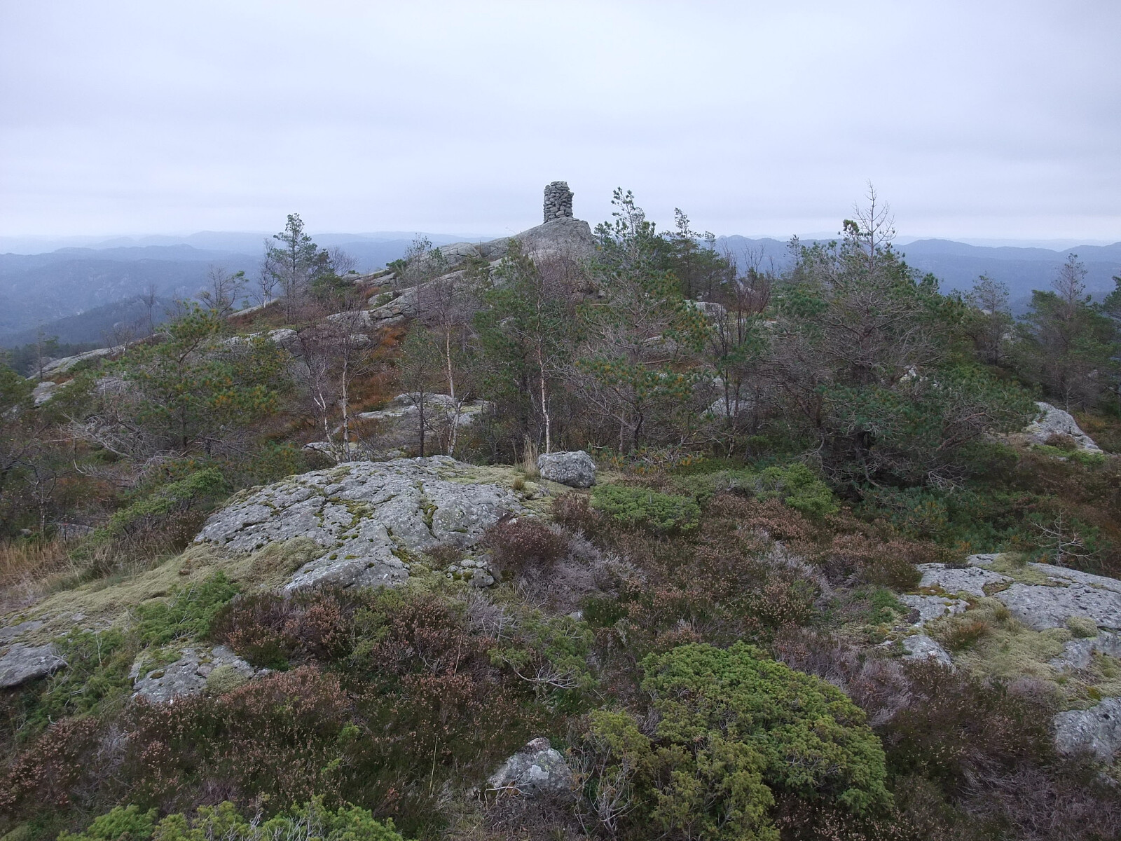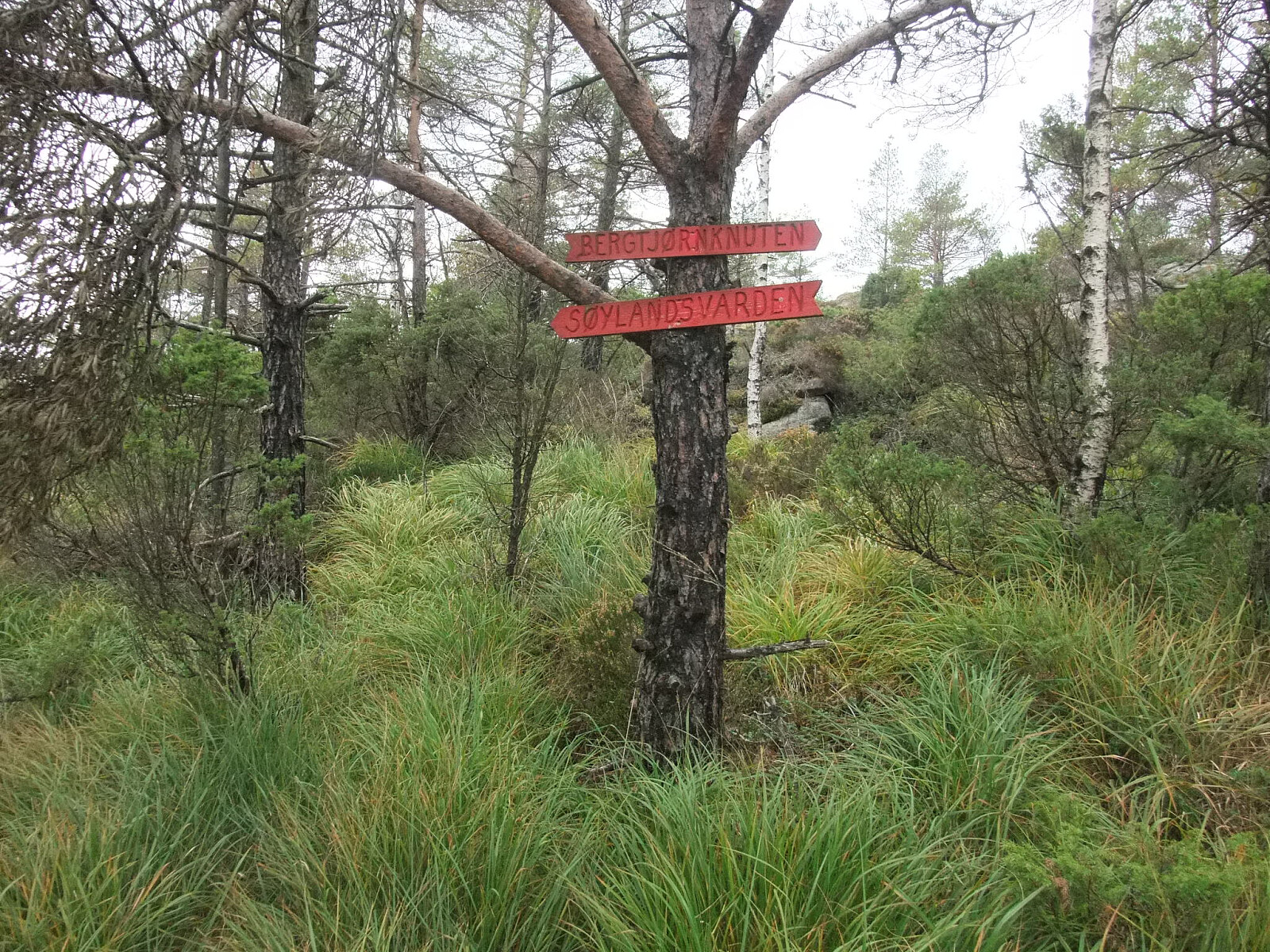 Fortsatte sørover i uryddig/ uveisomt terreng via Nordvannsknuten mot Bergtjørnknuten. Kom inn på ein ny sti vest for Bergtjørnknuten og tok ein tur sørover til Røde fjellan og Søylandsvarden og tilbake på stien til Bergtjørnknuten. Besøksbok på Søylandsvarden som var dominert av eit par gjengangere. Den stien kjem nok opp frå Søyland vest for Flekkefjord. Bergtjørnknuten har også vardebok.