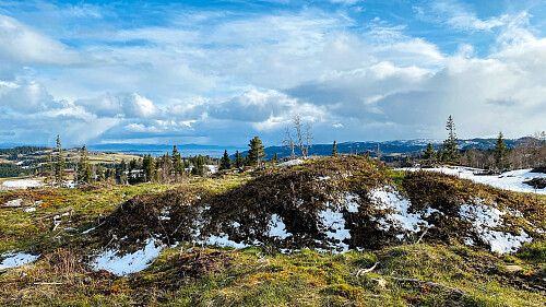 Etter å ha bodd som nærmeste nabo til Svean noen år fikk jeg endelig tatt den korte turen opp dit.Fin utsikt ned mot Trondheimsfjorden og ellers rundt omkring.Greit å få tatt turen hit før sauene kommer.Dette er inngjerdet beite her.Snart midten av Mai men snøbygene går jamt rundt her no.Ingen sommer i sikte enda.