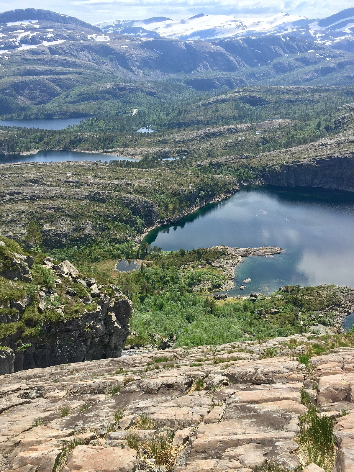 Retur ned i skaret og opp mot Nibba 823 via noen bratte berg med god friksjon. På toppen var det på tide å innta en liten lunsj i solsteiken. Returen var helt ok, greit å finne en vei, men det dukket opp noen småoveraskelser og omrutinger underveis :-) Vel nede igjen ved Vingevatnet kunne jeg se at det kanskje hadde vært bedre å legge ruta rett opp mot toppen allikevel. Men, det er jo som sagt mange veier til Rom!