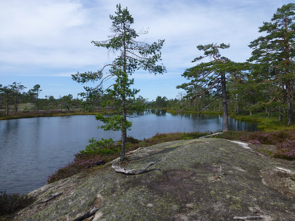 Jeg kjørte til Lunde og så videre mot Drangedal. Ved Gongevatn starter stien opp til Meheia, godt merket med røde trebrikker. Parkerte på en av de gamle vegtraseene og fant stien oppover, litt tett i starten, men helt greit. Stien følger en dal oppover i frodig terreng for så å gjøre en 90 grader halvveis og jeg kom opp på et høydeplatå med sva, myr og glissen furuskog. Stor kontrast til den frodige lia jeg kom opp. Klokkelyng og rome var for det meste avblomstret, men så at det måtte ha vært en fint skue. Etter ca 1 km svak oppover på sva og blåbærlyng med saftige gode blåbær, så var jeg på toppen. Ikke utsikt, men kasse.