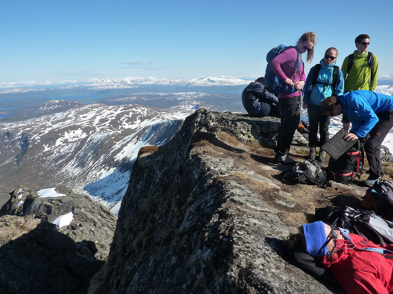 It seemed like there could be not better place to spend a summery saturday afternoon in northern Norway. And I couldn't have asked for a better group of people to spend it with either. It was a great atmosphere. Every now and then it was nice to just stand, sit or lean against a rock to gaze at the spectacular mountains everywhere and the afternoon seemed to pass by without us really noticing it. Although as the summit drew nearer my muscles were starting to indicate that they might not last for many more hours of the near-vertical exercise. But it didn't matter, because finally the ridge gave way to the summit, and we had done it. If I thought the views had been pretty amazing on the way up, then the views from the top were simply spectacular.