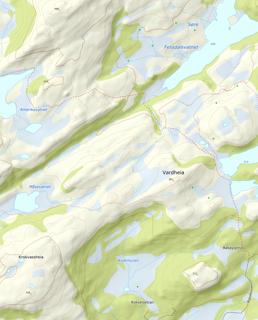 Da var turen kommet til Storsalen.Parkerte på en egnet plass ved Rokstevatnet hvor det allerede sto flere biler.Merket tur dette her så det var bare å gå på etter stien.Etter å ha passert Bakøysetran går det for det meste i myrterreng forbi Malitjønnan og i retning Fessdalsvatnet.Grei merking hele veien opp mot Amerikavatnet men du må belage deg på en tur i mye myrterreng som sagt.Ved Amerikavatnet møtte jeg et par som hadde vært ved flyvraket på Salan.En tur dit får bli neste gang for idag var målet toppen av Storsalen.Mye vind men varmt +21 gr.Tok så av stien og opp aksla mot Storsalen.Her var det endel rødmerking på stein men ikke nødvendig å følge det.Fin varde på toppen med påsatt et reinhorn.Fint oppe her idag men mye vind så da var det greit med sommertemp. i lufta.Flott utsikt mot alle "fjellene" i kommunen.Mat og drikke ble fortært før returen tilbake til start.Neste tur i dette området blir en samletur av topper og en tur innom flyvraket som ligger litt lengre ut på Storliheia.Vel Blåst!