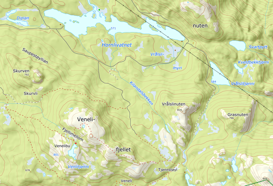 Svingte av rv41 mot Venelituromrdet, og kom til bomkasse. Vipps 60,-. Og videre til parkeringsplass ved Bendiksmyr. Her var info skilt om løypene i området. Jeg fulgte sti mot Venelifjellet 2,2km. Mye folk på tur denne dagen. Fin utsikt fra topen. Gikk videre på sti til Tjønnstøyl. Herfra uten sti mot Kollingan. Fin utsikt fra toppen her også, men fikk dessverre en regnbyge på toppen så stopen ble ikke så lenge. Gikk nedover samme vei mot vann, var noe dyretråk her. Ved nordenden av vann kom jeg på traktorvei og fulgte den helt til hytte ved Hornlivannet. Gikk her på ny traktorvei opp mot Hornlinuten. Gikk ettehvert over til sti. I ett stikryss som jeg tok til høyre burde jeg tatt til venstre her jeg kom ned. Fin utsikt fra topen her også. Returnerte på sti, vei og sti tilbake til bilen.