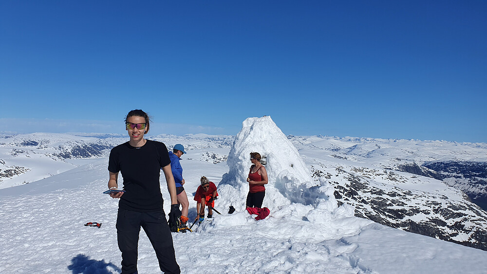 Vel oppe på toppen kunne vi nyte den fantastiske utsikten, i det overraskende varme været. Tilbake gikk vi samme vei, så ikke noe mer å skrive om det. For moro skyld tok jeg meg en tur oppom Hanken.