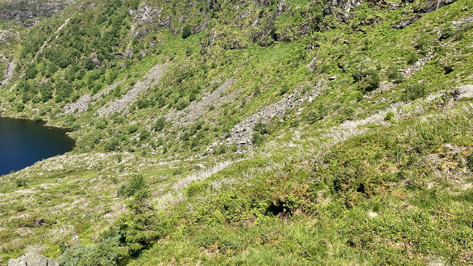 Det var enda tidlig på kvelden, og vi bestemte oss for å gå ned en uvanlig rute fra Langelivatnet, nemlig i det som er beskrevet som Råka. Helge hadde gått her tidligere og funnet små, men tydelige nok varder et stykke nedover i lien. Det gjorde vi også denne gangen, men på omkring 400 moh forsvant/mistet vi vardingen. Herfra er det et meget strevsomt, fullstendig tilgrodd og bratt terreng videre nedover. Ingen fornøyelse i det hele tatt.