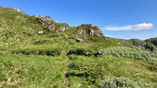 Fra Venus (ruin) fortsatte vi på stien mot Vidden, men tok av fra stien oppover mot nord ca. 500 moh i retning mot Norrønahytten (ruin). Ingen tydelig sti her, men lettgått terreng.