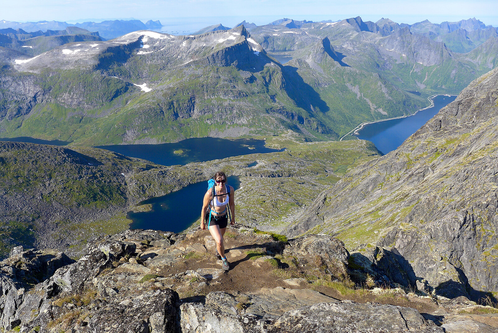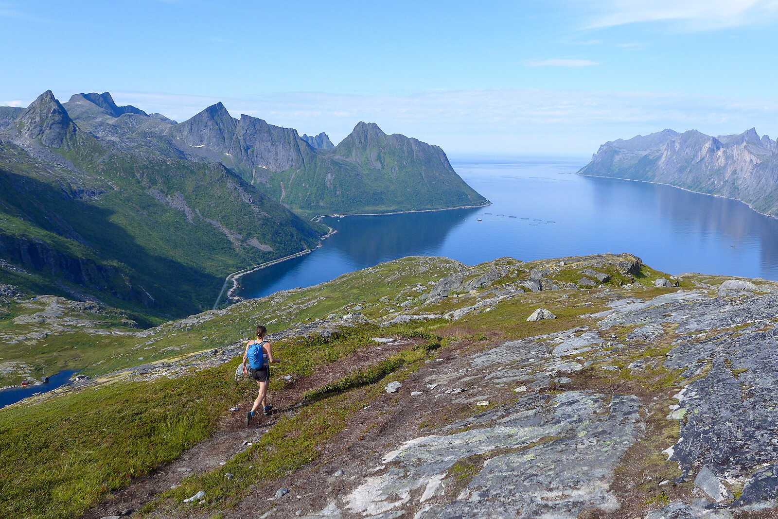 Det var meldt knallvær for helgen og da hadde jeg bestemt meg for å utnytte det ved å tilbringe den på eventyrøya Senja i lag med Renate. Hadde gått noen måneder siden sist vi møttes så det var koselig å treffes igjen. Forrige gang jeg hadde gått en tur på Breidtind var for 4 år siden, så det føltes som om det var på tide med en ny tur dit. Vi bodde på ei liten hytte på Skaland, så det tok omtrent en halvtimes tid for å kjøre til parkeringsplassen ved Svartholatunnelen der vi skulle begynne turen. Allerede i 9-tiden var det veldig varmt, så vi var ganske glad for at det ikke ble en seinere start da det ble kokvarmt. Ble litt plaget av svartfluer i skogen, men det var ellers ganske greit mtp insektsituasjon. Fulgte en godt merket sti hele veien som tok oss rundt nordsiden av Breidtindvatnet og opp mot sørvestryggen, noe som gjorde at vi endte opp halvveis opp den før klyvinga startet for fullt. Tidligere har jeg gått langs kanten av vatnet for så å komme opp til skaret ved foten av ryggen. Litt usikker hvilket alternativ jeg foretrekker men hvis man ønsker mer tid på eggen og ikke på bratt sti, da er det helt klart best å ta sikte på skaret sørøst for Breidtindvatnet.