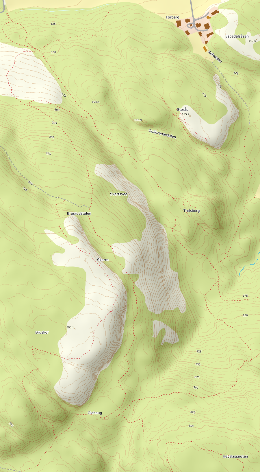 Bruskor p-plass ligger like ved riksveien vest for Bø sentrum. Dette er et fint utgangspunkt for turer i området. Jeg fulgte en merket sti som gikk direkte opp til Bruskor. Herfra er det flott utsikt blant annet til Bø sentrum. Jeg syntes turen opp var noe kort, samtidig som at det var et flott turområde å ferdes i! Jeg gikk derfor videre ned på baksiden av fjellet og snirklet meg rundt flere steile skrenter før jeg til slutt ankom Høyslassnuten. Artig natur og flott utsikt også herfra. I dette området er det enkelt å få til en rundtur, noe som jeg etter et par forsøk fikk til ;)
