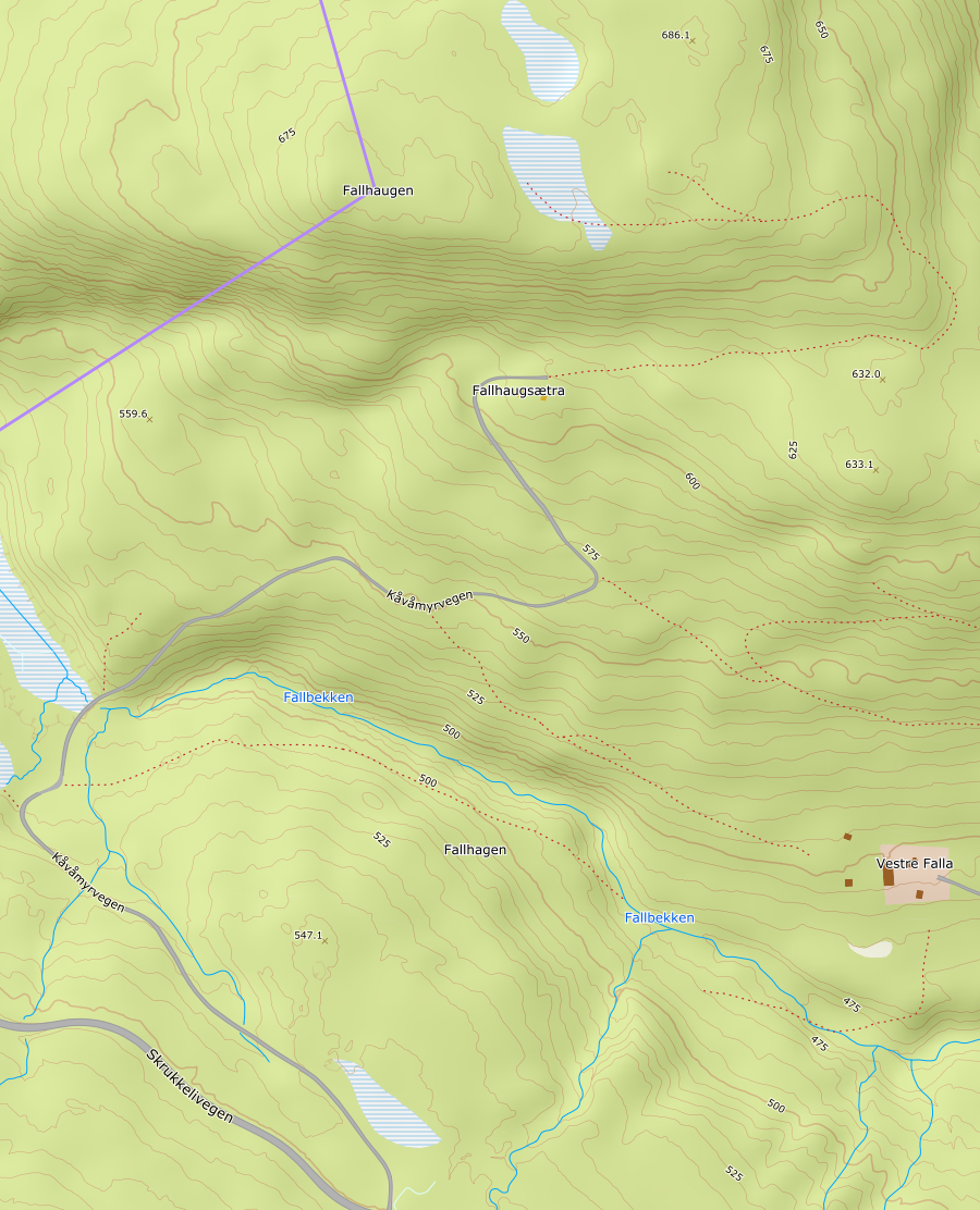 Fra Lygna fulgte jeg rv180 østover forbi fylkesgrensa og frem til Kåvemyrvegen. Veien er stengt med bom så jeg parkerte på siden av veien like ved bommen, det er plass til et par biler her. Det begynte å snø litt da jeg var på vei oppover, noe som gjorde terrenget litt lysere og friskere. Veien endte opp ved antennemasta oppe på toppen, mens det høyeste punktet på Fallhaugen ligger omtrent 300 meter rett vest for masta. Det er også en trigpunkthøyde som ligger 100 meter nord for masta. Jeg hadde god tid og valgte å rusle bort til trigpunktet først. Dette viste seg å være en åpen lysning i skogen uten utsikt. Herfra gikk jeg tilbake igjen til masta og satte kursen rett mot det høyeste punktet lenger vest. Det var ingen tråkk bortover her, og anelsen om at heller ikke dette var et spesielt severdig sted stemte på en prikk! Her var det ganske tett skog, og jeg fant heller ingen markering av toppunktet. Jeg fant for øvrig en gammel varde som markerte fylkesgrensen som sneier toppen litt nede i lia i sørvest. Herfra skimtet jeg en skogsås på motsatt side av dalen. Jeg fulgte samme vei tilbake forbi masta og ned igjen langs veien.