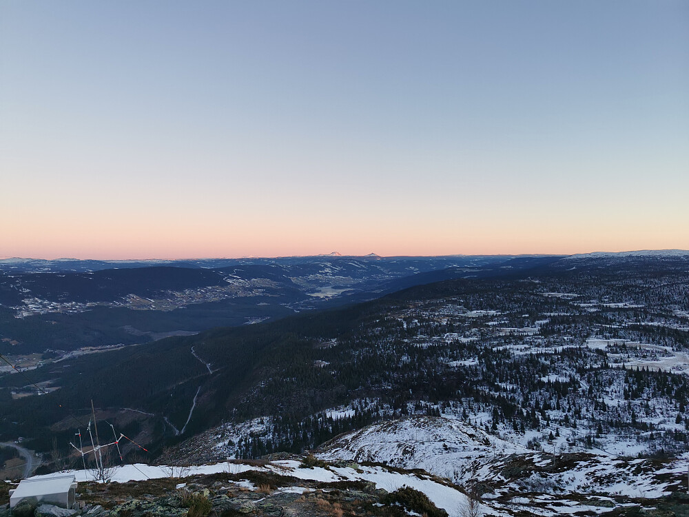 På grunn av de tunge snøforholdene og påfølgende tidsbruk var det ikke langt unna solnedgang da jeg ankom toppen; fantastisk utsikt i klarværet som hadde laget seg til i dag. Meget lettere ned igjen; nå er her spor...