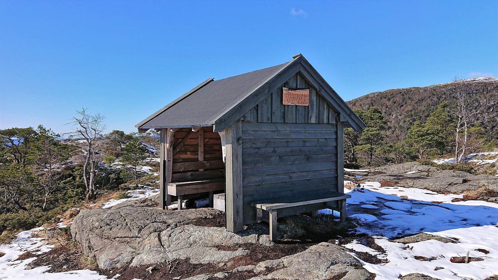 When the rest of my colleagues embarked on the bus back to Bergen, I began my hike from Solstrand and soon arrived at the steep ascent to Borgafjellet. Little to no snow at the start, but it gradually increased as I got closer to the summit, with perhaps a couple of centimeters covering the area around Borgabuo. Borgabuo was however not the only new addition since my last hike at Borgafjellet. There was now also a new shelter called Borgly right next to the trail at Høgehaugen, with excellent views to the many snow-covered peaks across the fjord.