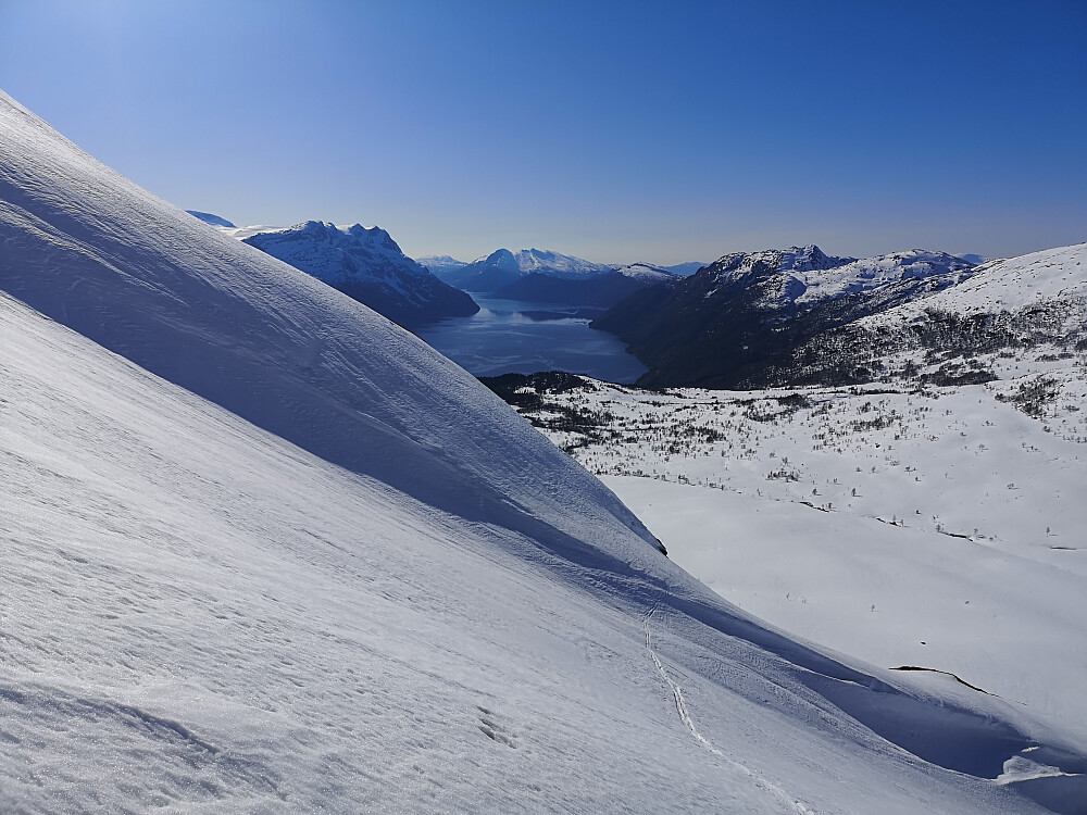 Nydelig ettermiddagstur i herlig vær. Gikk opp Gjørva og merket at det i dag var mer oppvarmet og bedre muligheter for nedkjøring samme vei.