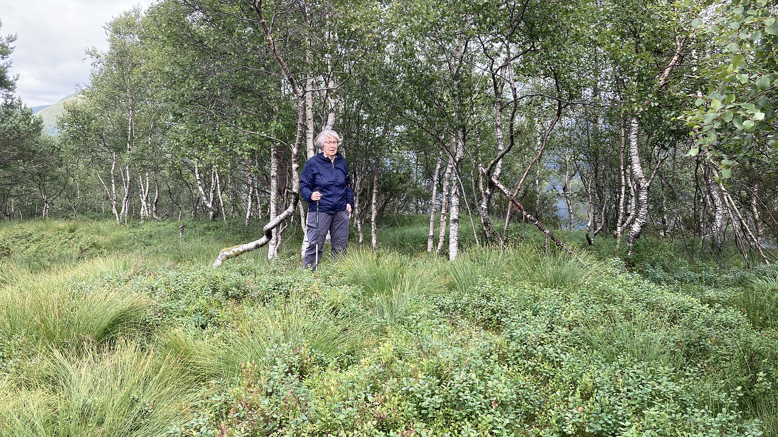 På returen fulgte vi en svak sti langs ryggen og videre gjennom høyt gress og myrområder tilbake til grusveien og bilen.