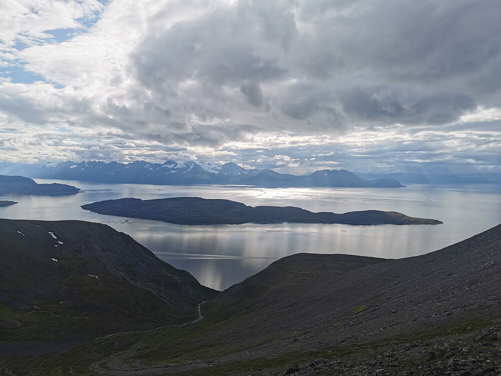 Bortsett fra lureriet og topputsikten som uteble gikk returen greit og rimelig raskt (uten bruk av tåkelur); det var slettes ikke godt å si hvilket vær som kunne finne på å dukke opp, og bare å komme seg ned raskest mulig uten hals og -ankelbrekkende stunts, til bl.a. deilig laksemiddag på Hotel Maritim på Skjervøy. Skjervøy er forresten verdt en kommentar; så ut til å være et livskraftig kommunesentrum med en mengde fiskebåter og det meste av servicefaciliteter på plass i tettbebyggelsen på selve øya Skjervøy forbundet med Kågen med en bro. Vurderte å bli en dag lengre med sikte på bestigning av Arnøyhøgda, men meldt kraftig nedbør, torden og vindkast opp i storms styrke neste dag, så Arnøyhøgda får vente til en annen gang. Fikk en god natts søvn før den lange kjøreturen sørover med Lines nye bruktbil, med håp om opptil flere nyttige stopp under veis.