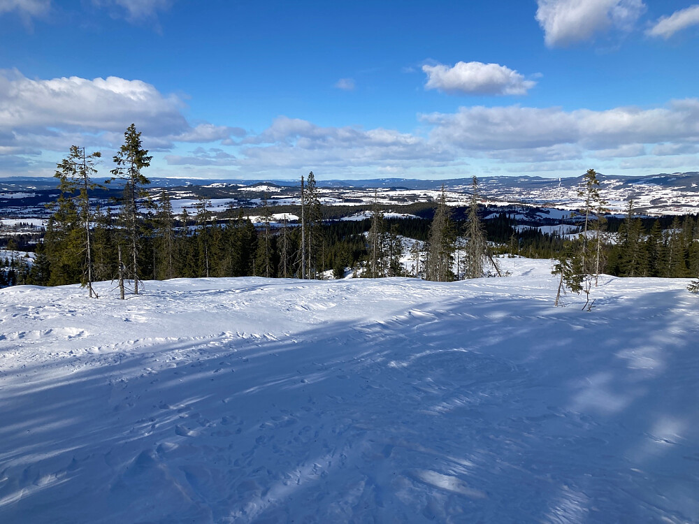 Hadde egentlig planlagt kun Bislingflaka, men på vei tilbake til Mylla Dam så oppdaget jeg en løype ut på Mylla og da var det ikke så langt til neste rødnål heller. Med litt lite mat og drikke i sekken var det ikke så veldig smart kanskje. Vi gikk med felleski begge to, og i bakkene oppover mot Ballangrudsæterhøgda var skiene ganske bakglatte. Tørrvoks hadde fungert bedre i dag. Men vi sparte mange krefter på den ca 300 meter lange skuterløypa fra skisporet til topps på Ballangrudsæterhøgda som vi forserte til fots.
