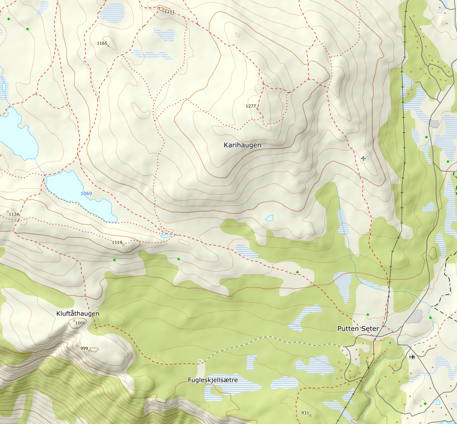 Det ble også en ettermiddagstur denne dagen, men den måtte jeg gå alene;) Fra hytta på Putten gikk jeg først opp til Karihaugen. Denne turen synes jeg er et veldig fint alternativ når man ikke har så lyst til å tråkke løypelangs. Fra toppen gikk jeg videre ned og bort til Anaripigg, før jeg satte kursen ned via Horrtjønnin og opp på Hårrtjønnhøe. Herfra direkte kurs tilbake til hytta, stort sett på oppkjørte løyper.