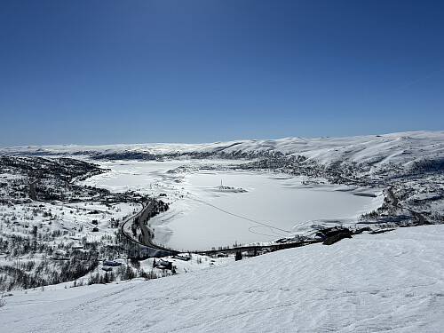Jeg parkerte på p-plassen der hvor Rallarveien starter på Haugastøl. Herfra gikk jeg på bru over jernbanen og videre bratt oppover lia forbi noen hytter retning Tjørngravtjørni. Like før vannet dreide jeg til venstre og opp på Fjellbergnuten. Utsikten var fenomenal og været likeså. Videre opp til Slåttehallnuten passerte jeg tre mindre koller før dagens første rødtopp kunne innkasseres. Det ble en liten matpause på toppen før jeg suste nedover bakkene retning Nygardnøse. I bakkene opp mot toppen var snøen litt hard og skarete enkelte steder, men med stålkanter og skifeller gikk det veldig greit. Nygardnøse overgikk alle forventninger og var utrolig stilig der den ligger litt for seg selv med en helt rå utsikt, spesielt østover mot Hallingdalen. Jeg koste meg lenge og vel der oppe, og for å toppe det hele fikk jeg "selskap" av en ørn som svevde over toppen i nesten 10 minutter. Herlig! Tilbaketuren gikk via nordtoppen og ned til Nygardsvatnet som ble fulgt tilbake igjen til bilen.