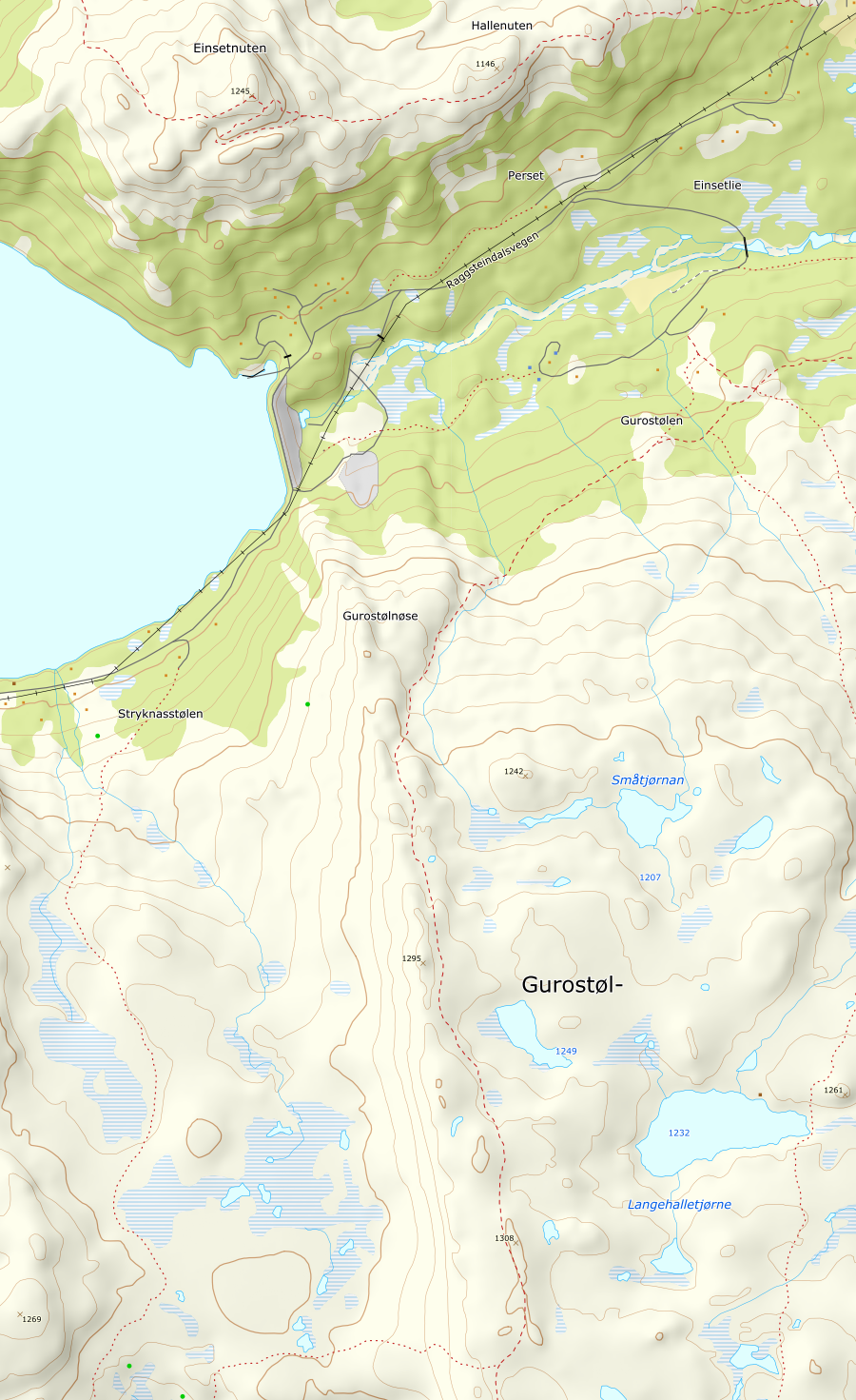 Ved Småtjørnan flatet det ut litt og jeg kunne se bort til den beskjedne toppen av Gurostølfjellet. Det er flere høyder som er omtrent like høye her inne så gps'en var god å ha. Nydelig skiterreng og strålende vær gjorde sitt til at turen ble forlenget med en avstikker til Millomfjellet i samme slengen. Planen var å få til en fin rundtur hvor jeg kunne få glede av litt god gli ned via Gurostølnøse tilbake mot bilen. Dette gikk fint, dog uten den gode gliden som jeg hadde håpet på. Fra Gurostølnøse så jeg over til Einsetnuten og bestemte meg for å besøke denne også når jeg var så godt i gang:) Det var bedre glid på denne siden og snart var jeg nede i dalen igjen. Jeg gikk bare rett over veien der hvor jeg hadde parkert, forbi et par hytter og snart var jeg oppe på Halnenuten. Herfra så Einsetnuten litt bratt ut, men som så ofte før var det mye lettere enn det så ut. Vel oppe kunne jeg nyte utsikten som var mye flottere herfra enn fra Gurostølfjellet. Resten av maten ble fortært og dermed var det bare å skli ned igjen til bilen og sette kursen hjemover.