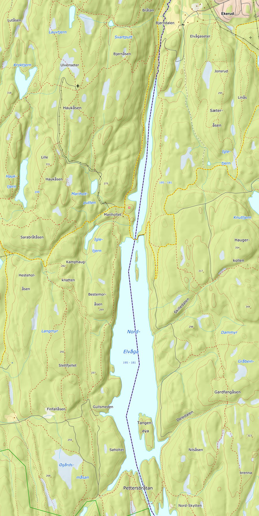 Fra sti/veidelet gikk jeg til fots via Svarvestolsbrenna, Skråbakkåsen og Skogbakkåsen før jeg ankom Nordre Skytten hvor posten var plassert. Jeg gikk også oppom Sagåsen før jeg kom tilbake til sykkelen igjen. Alle disse toppene var små koller inne i skogen uten utsikt og den store opplevelsen. Neste post var oppe på Lille Haukåsen så jeg syklet nordover igjen langs Nord-Elvåga, forbi Mariholtet og opp mot Haukåsen. Sykkelen ble parkert der hvor den blåmerkede stien krysser veien. Herfra gikk jeg opp til Lille Haukåsen og kunne innkassere dagens andre post. Åpen kolle med sittekrakker, men uten særlig utsikt. For å få til en rundtur også her, gikk jeg ned på andre siden, rundet Hauktjern og gikk via Hauktjernåsen og Kroktjernkollen opp til Haukåsen. Sistnevnte ble kåret til dagens fineste topp, til tross for antenneinstallasjonene på toppen. Nå var det bare siste etappe igjen; ned til sykkelen og raskeste vei tilbake til bilen.