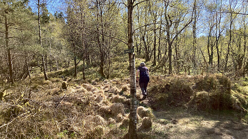 Vi forlot veien og gikk inn på en god skogssti vest for toppen. Fulgte denne et stykke og fortsatte på svak sti til toppen som ligger på 32V 298772 6688819. Høyde 256 m og PF 21 m ut fra norgeskart.no med sadel på 235 m mot øst. Foreløpig ligger toppen inne med høyde 1256 for å omgå nærhetsregelen på PB, PB-adm er kontaktet.
