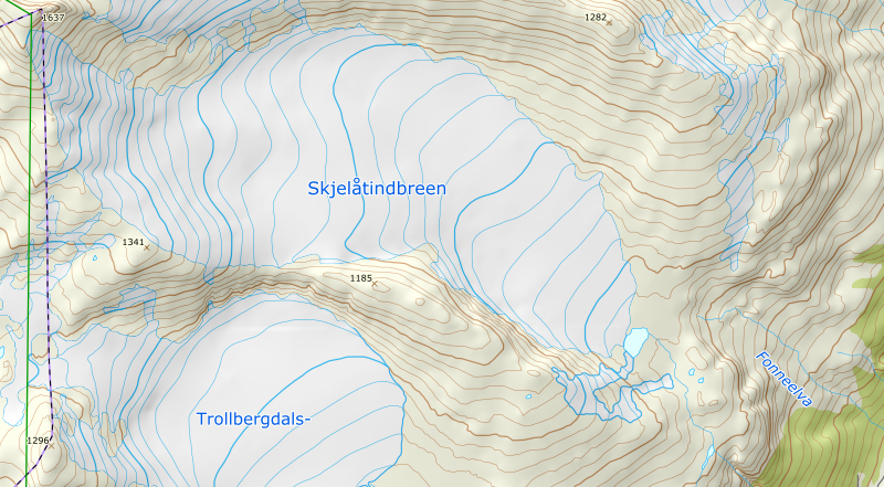 Etter to vellykkete turer i perfekt nordnorsk sommervær (Suliskongen og Lurfjelltinden) var vi, dvs Knut Sverre og jeg noe mer usikker i forhold til det tredje toppturmålet vi hadde tankt ut for denne mini-turneen til Nordland, nemlig Skjelåtinden, som er kombinert kommunetopp i Beiarn og Meløy. De fleste registrerte turer på Pb hadde gått på ski, men også noen sommerturer. Nå var vi "midt i mellom" rent årstidsmessig. Vi forhørte oss både ved turistkontoret(hyggelig prat her!) og en lokalkjent(Marius) som vi fikk tlf nummeret til. Våre største usikkerhetsmomenter var snøbeskaffenheten generelt og kryssing av Fonnelva under brefronten til Skjelåtindbreen spesielt. Skibestigning hadde vi for lengst slått fra oss, til det mente vi det var for sent på sesongen, med usikkerhet ift bresprekker etc, særlig med det varme været som hadde vært de siste dagene. Marius mente snøkvaliteten var bra, og at vi kunne omgå Fonnelva ved å runde på breen like over der elven kommer ut fra brefronten.