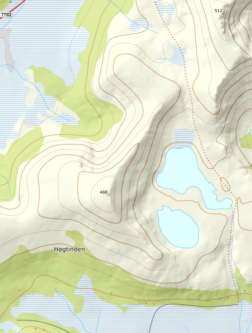 Lettgått terreng til begge toppene, og sti det meste av veien. Ned fra Høgtinden var det litt mer trøblete med mye steinur. Hadde muligens lønt seg å gå samme vei tilbake, i hvert fall på en dag som denne (null utsikt).
