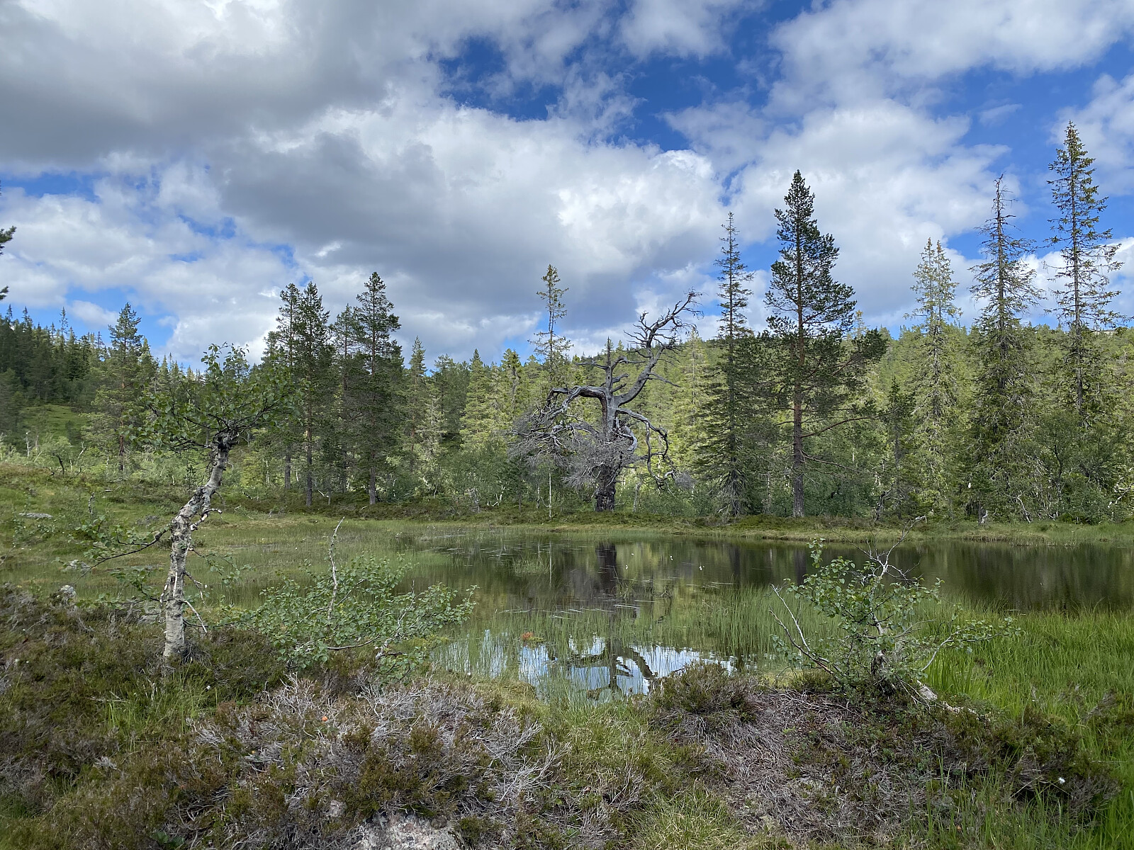 Vi brukte om lag 50 min på god sti langs østsida av vatnet og opp til en rød hytte litt oppi lia øst for Kilsåa. Flere steder langs vatnet holdt engstelige strandsniper oss med selskap. Fra hytta fortsatte stien opp til elva som var enkel å krysse denne finværsdagen, selv etter noen regnværsdager. Herifra var det sti et stykke også på vestsida av elva, men oppe ved myrene forsvant den. Her fulgte vi imidlertid bekken fra Kilskar vestover og tråkket vår egen løype tungt, men greit opp i skardet. Her var det ganske mye elgskitt, og vi såg også endel dyrespor, men vi var ikke så heldige at vi fikk se dyr.