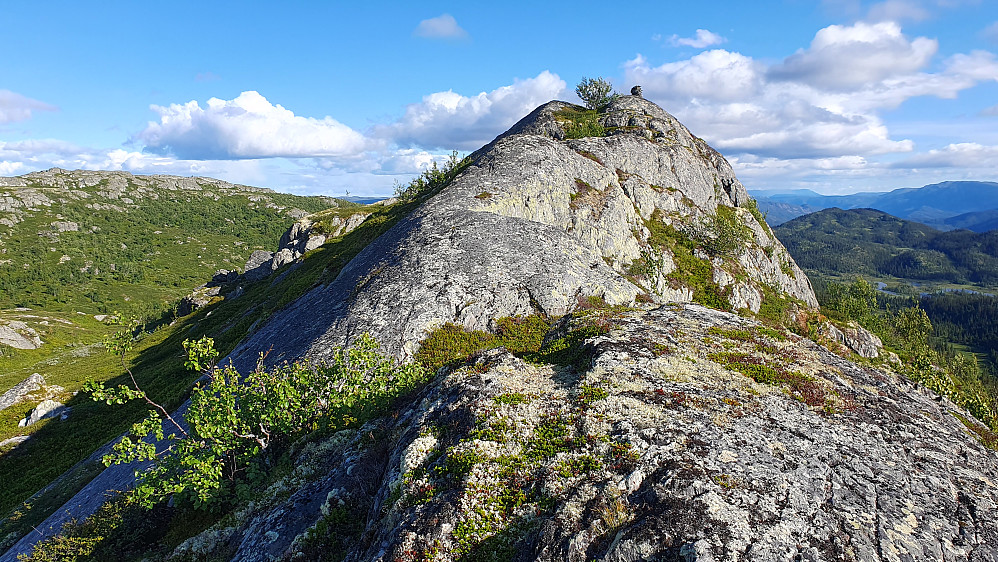 Men prikken over i'en og dagens mest spennende topp, ble helt klart Ryggfjellets sørligste og høyeste punkt på 1123 moh. Denne toppen var flott, og nesten litt luftig. Med vindkast man kjente på kroppen var det nesten litt utfordrende å gå nordover fra denne toppen. De første meterne her besto av en litt smal rygg, og med den friske vinden på skrå imot måtte jeg konsentrere meg på denne passasjen. Her ville det vært svært uheldig å falle ut mot vest, da det enkelte plasser var små stup og veldig bratt den veien.