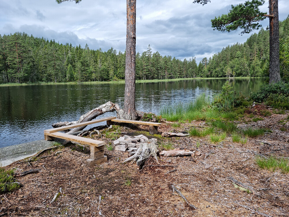 Jeg hadde glemt bekrivelsen hjemme og vi hadde feil spor på gps-en vår. (Sporet var via Brattningsborg). Ikke måte på hvor vanskelig denne toppen skulle være å få tatt. Da det i tillegg ikke var dekning oppover og i perioder bare grått på kartet på appen, ja da ble jeg litt stresset. Husket bruddstykker av beskrivelsene men trodde jeg hadde lest at jeg skulle se etter den lille hytten ved vannet. Derfor gikk vi et stykke nedover vannet og leita etter hytta før jeg skjønte det var feil. Men vi fant en idyllisk bålplass. Snudde og fant en grønnmerket sti som gikk opp til hytta og fortsatte videre oppover. Ikke lett å se merkingen pga grass og lyng, men kom til ATV-sporet og fulgte det oppover og over til blåmerket sti. Mange fine marihender der. Ikke så god merking her heller, og på slutten forsvant merkingen helt og vi ga opp å leite og fant oss et tråkk oppover og villgikk litt til toppen. Det kom regn på vei opp og det drypte litt nå og da på vei ned, så både Yr og Storm tok feil i dag. Satt og spiste nisten vår på toppen før vi tuslet ned igjen. I varden lå det en utskreven bok fra laaang tid tilbake i en Nesquicboks. Prøvde å følge den umerka stien fra toppen, men også denne forsvant og vi skar over og inn på sporet vårt etter hvert. Bedre "vei" der vi gikk ned. Så mange flaggspetter på veien. Spiste mange deilige modne blåbær. Der var det mye bær.
