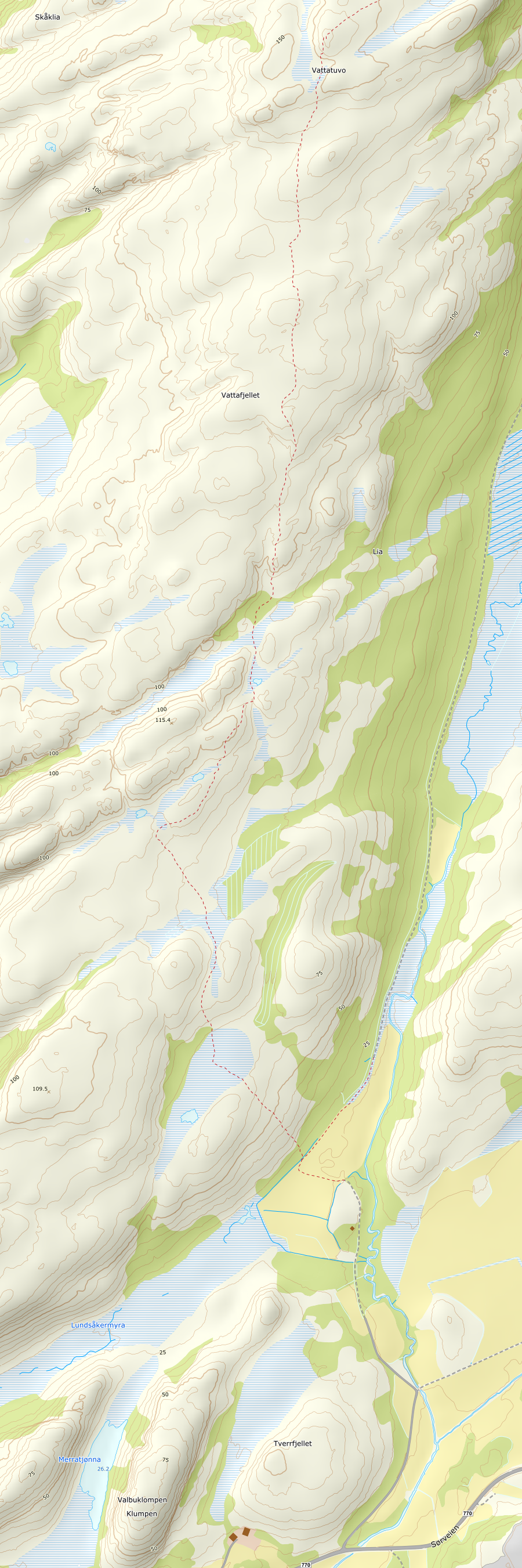 Omtrent 3 kilometer vest for Rørvik går det en skiltet og merket sti til Vattatuvo. Der hvor man svinger av fra hovedveien er det laget til en fin p-plass hvor jeg parkerte bilen. Herfra fulgte jeg skilting mot Vattatuvo, først på grusvei, deretter på sti. Turen gikk på langs av hele Vattafjellet før jeg endelig sto på toppen av Vattatuvo. Fin topp og storveis utsikt!