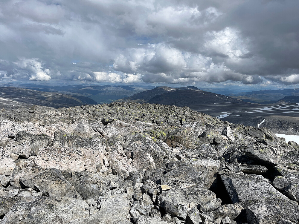 Dette ble kanskje den tøffeste fjellturen jeg har hatt. Overnatta på campingen på Lom. Tanken var å telte inne i dalen, men kom inn for seint. Ble innlosjert på hytte ca. 21.30 om kvelden. Tok av gårde tidlig, og startet å gå innover Lundadalen kl. 07.45. Lang innmarsj. Tok den gamle stien til Trulsbu for å komme på rett siden av elva. Stien var litt utydelig etter brua, men var grei nok å følge. Den var delvis vardet. Var inne på andre siden av Sauehytta etter ca. 3 timer og startet oppstigningen til steinura. Elva som rant ned fra Heimste Brean var ganske stor, men delt i flere løp, så det gikk greit å passere uten å plumpe uti. Prøvde å unngå den verste ura opp skråningen. Men etter 1500 moh var det ubønnhørlig ur og bratt. Det ble brattere og brattere med mye løs ur noe som gjorde at en måtte være svært forsiktig. Her gikk det seint. Uendelig seint og høyden merkes godt. Etter 1800 m ble det enda brattere og enda mer ur med til dels store blokker. Kom til slutt over kanten og kunne se mot toppen. 'Never ending ur'. Her var det lettere å gå, men når stigningen til toppen startet ble det enda mer til dels stor ur. 300 m fra toppen var jeg svært sliten og hadde mest lyst til å gi opp, men været var fint, vindstille og sol med skyer rundt. En gir ikke opp da! Etter litt mat- og drikke-pause fikk vi presset oss opp de siste 150 høydemetrene til varden. Var opp ca. 14.15. Så selve oppstigningen tok ca. 3-4 timer. Etter fotoseanse og mat ca. 1 time bar det ned igjen. Utrolig og sitte her i vindstille og sol med til dels mørke syer langt unna og nyte den flott utsikt. Prøvde å følge noen spor fra andre som tydeligvis hadde vært på toppen med hund tidligere på dagen. De hadde gått litt lenger sør. Her var det betydelig mindre ur, men lenger ned ble det uunngåelig med mer ur. Måtte være ytterst forsiktig så vi ikke fikk noen skader i denne ura. Enkelte store blokker var løse og kunne godt vippe over. Her er det ingen mobildekning! Kom ned til stien igjen etter ca. 3 timer - skikkelig mørna i lår og knær. Vurderte å vasse over elva for å kommer over til Sauehytta, men vi besluttet å gå samme vei tilbake. Tilbaketuren gikk på trass og ren vilje i jevn fart med flere mat- og drikke-pauser. Tok vel litt over tre timer. Kjørte tilbake til Lom og fikk ny hytte på campingen litt over 21. Det ble en lang dag. Dagen etter var lår og knær temmelig mørbanka og det var nesten problemer å komme seg inn i bilen. Været holdt seg bra. Vi fikk noen få regndrypp nederst i ura, deretter ble det fin vær igjen. For en gangs skyld ble det slik Yr hadde lovet.